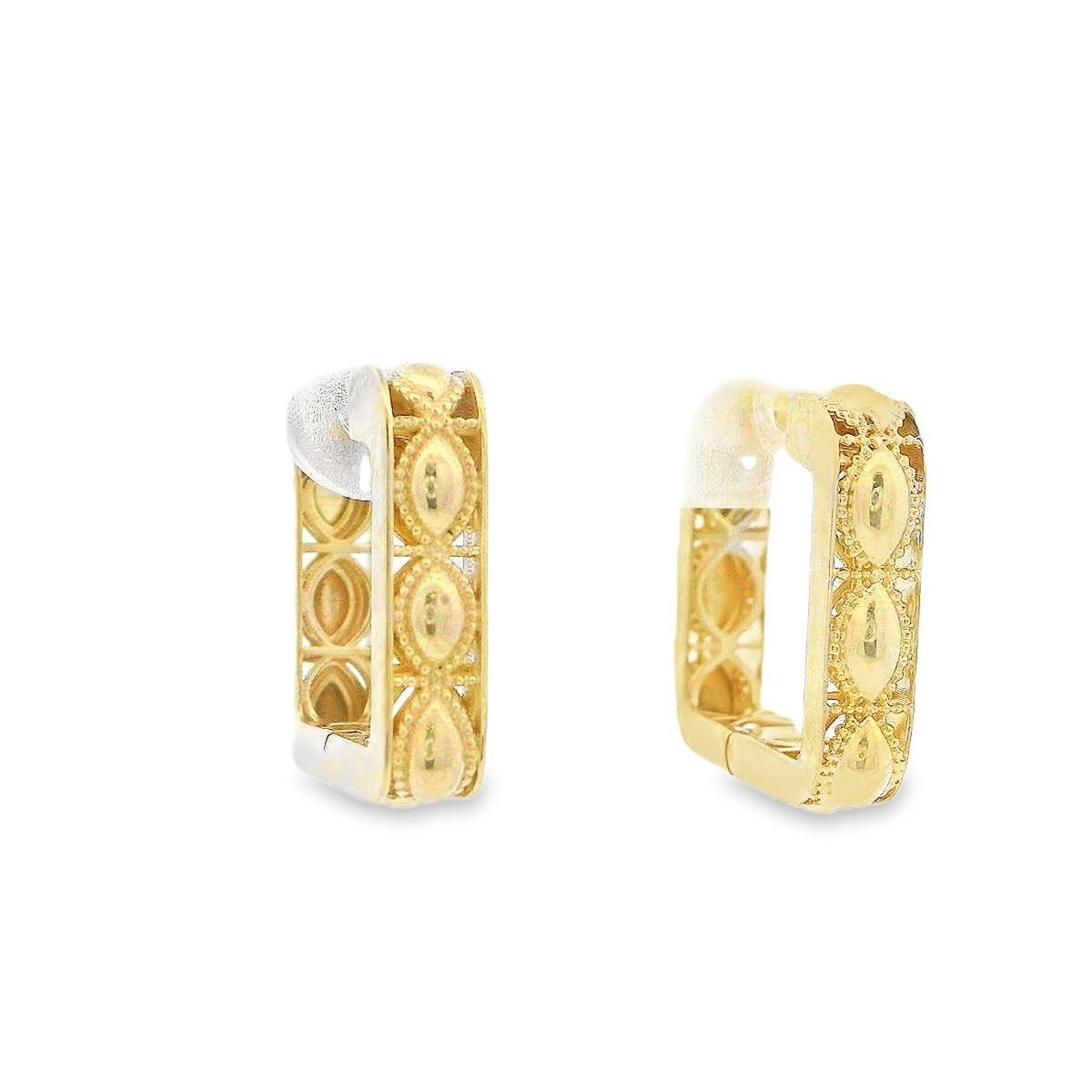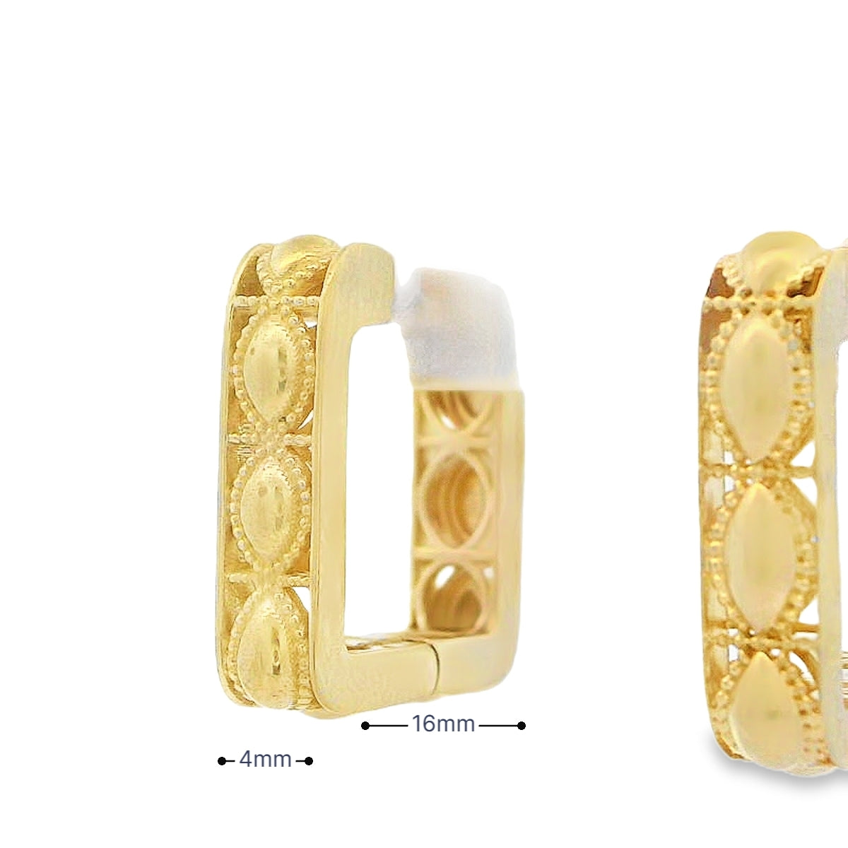 Indulge in the ultimate luxury with Julz's 14k Gold Square Earrings. These sophisticated hoops feature intricate cutouts that catch the light perfectly, giving you a radiant glow. A stylish and elegant accessory for any occasion, these earrings are a must-have for adding a touch of glamour to your look.
