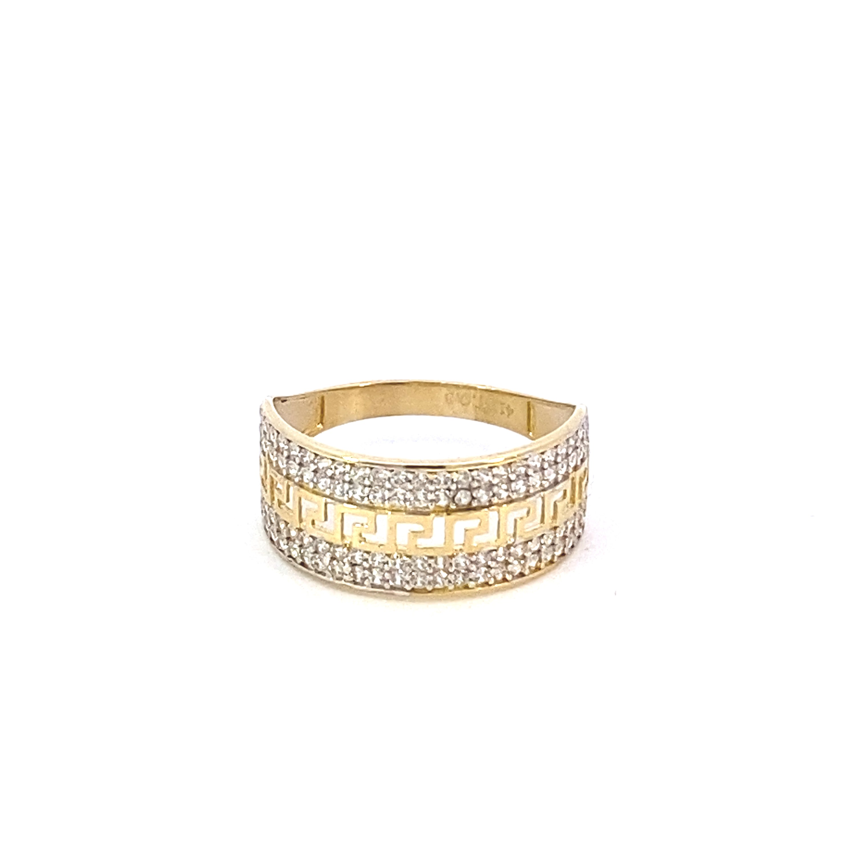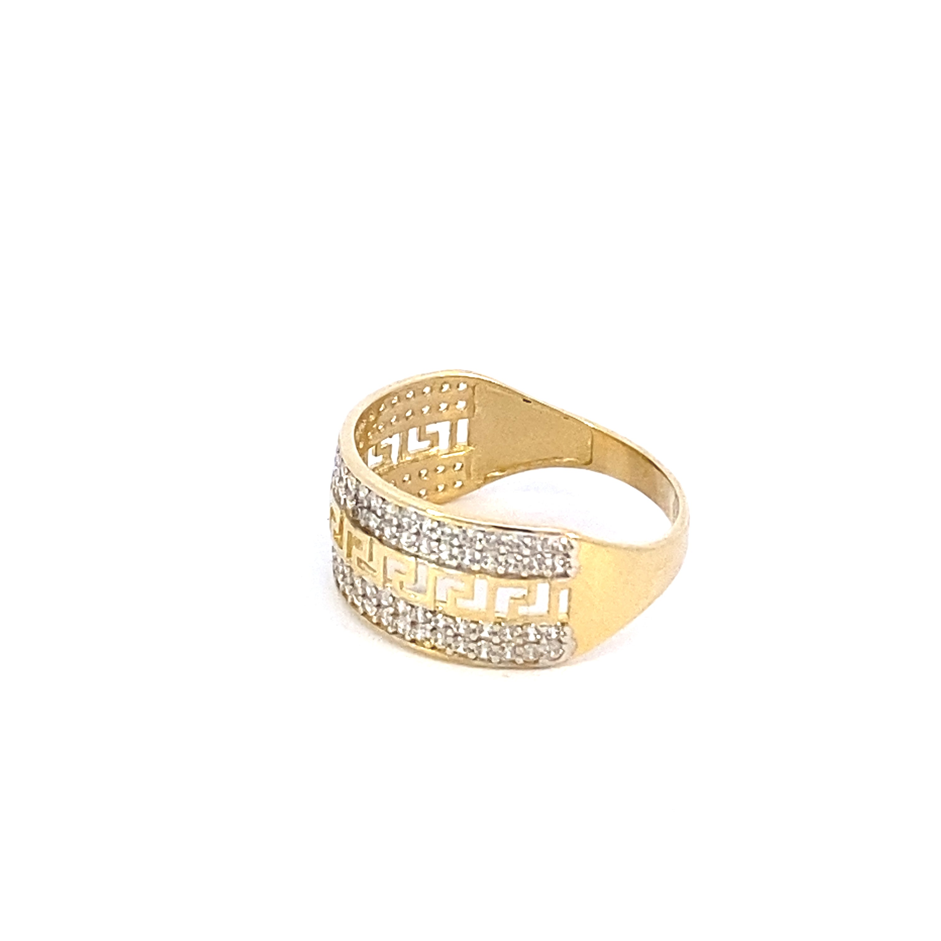 10k yellow gold ring with zirconia stones. medusa greek key deign