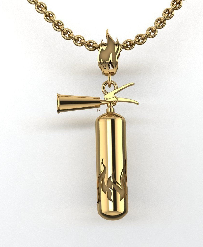 Set hearts ablaze with this exquisite 14K gold fire extinguisher pendant. Perfect for firemen or firewomen, this pendant is a symbol of courage, dedication, and heroism. Show your appreciation for these everyday heroes with this unique and meaningful piece of jewelry.