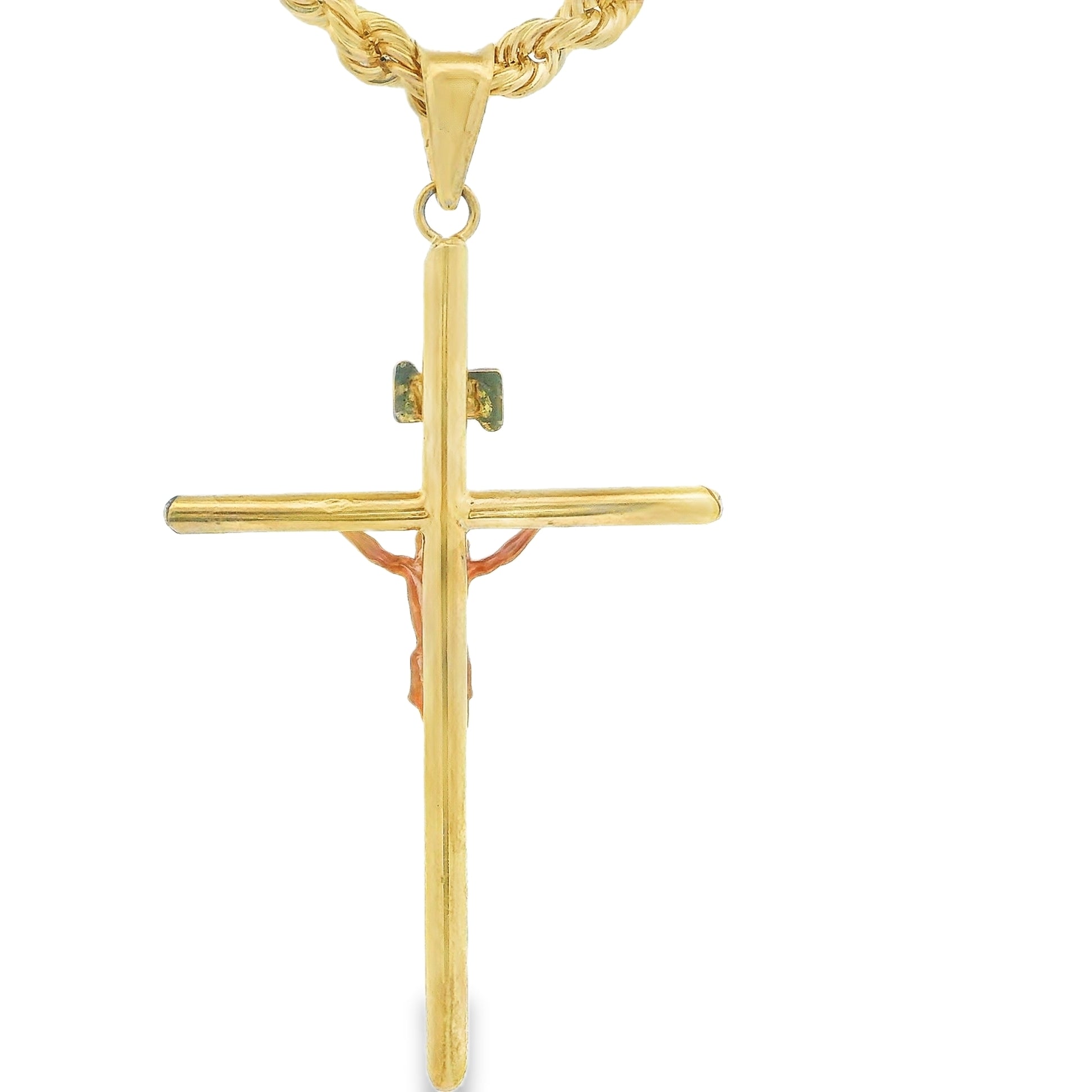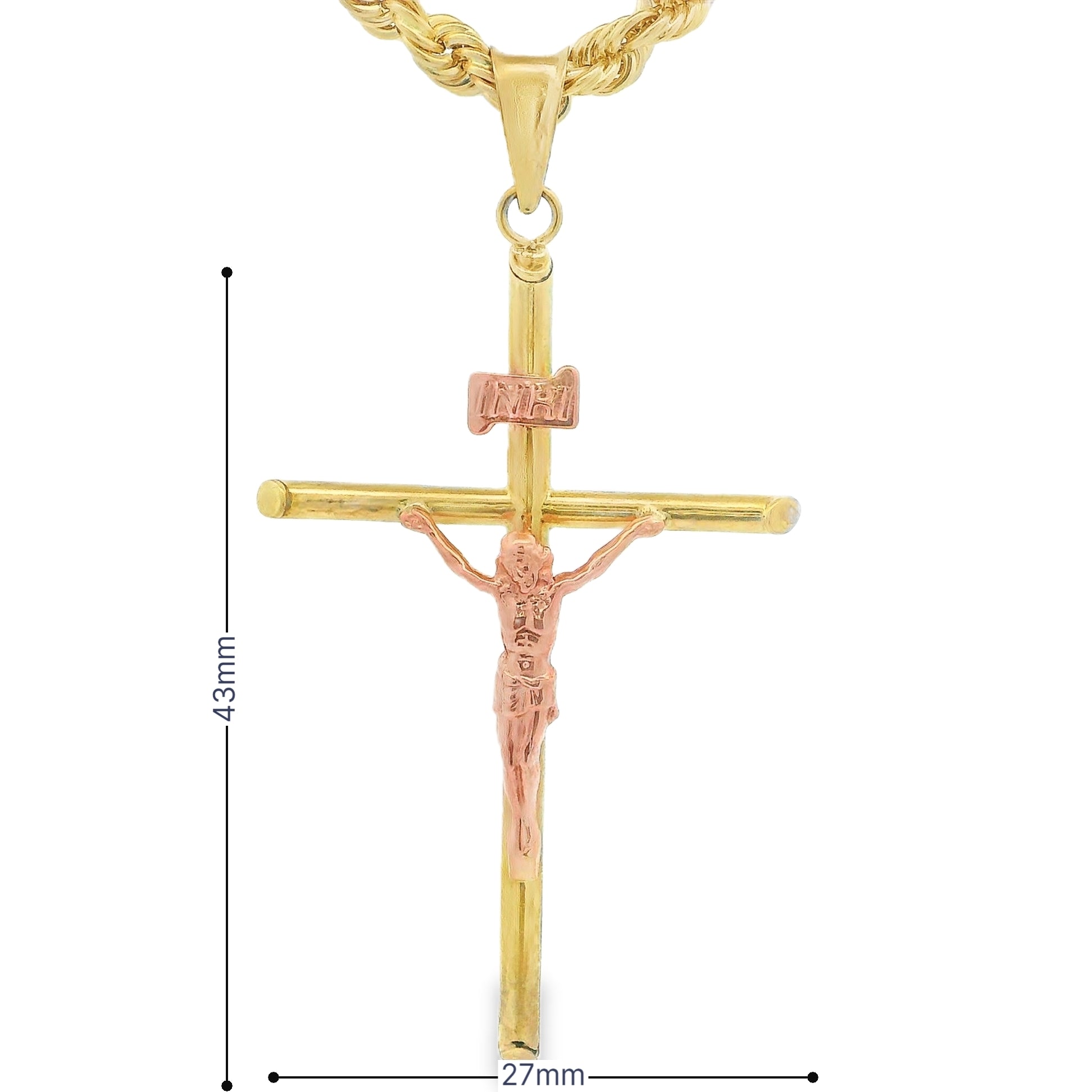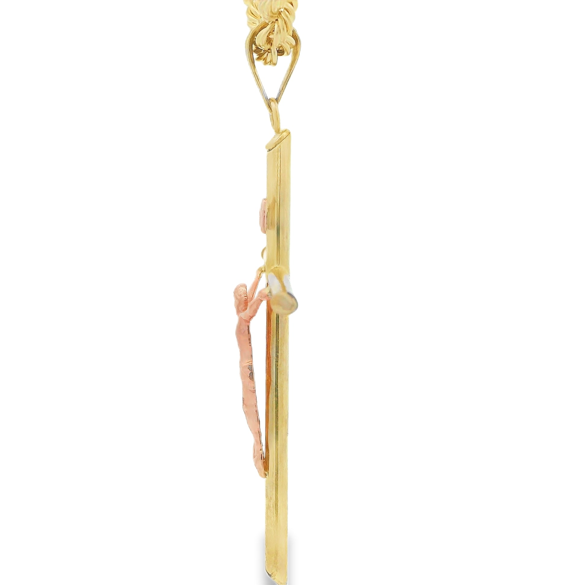 This stunning cross pendant beautifully combines gold and rose gold tones, creating a striking contrast that captures the eye. The intricate design features a detailed figure, making it a meaningful piece for personal expression or as a thoughtful gift. Perfect for everyday wear or special occasions, this pendant adds a touch of elegance to any outfit.
