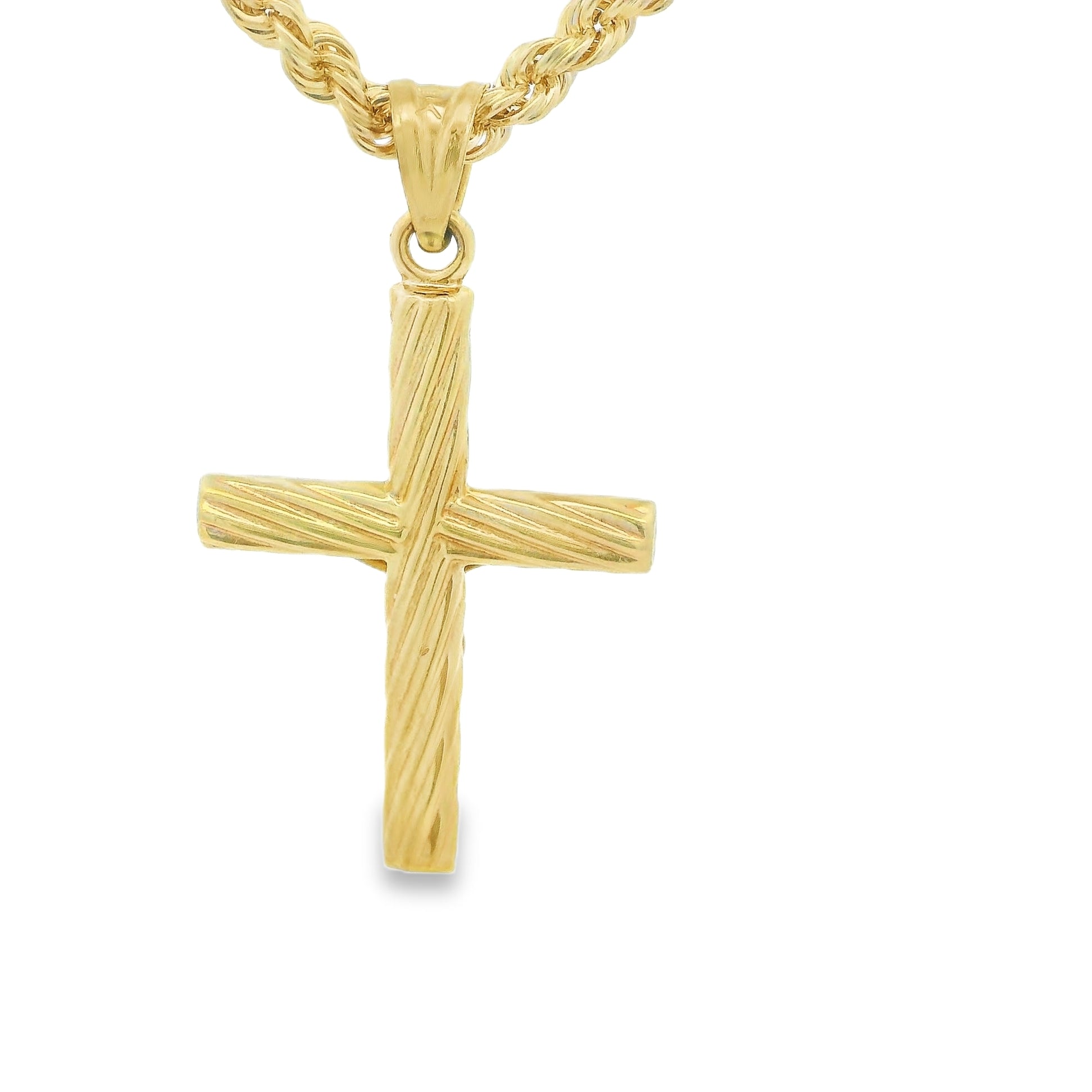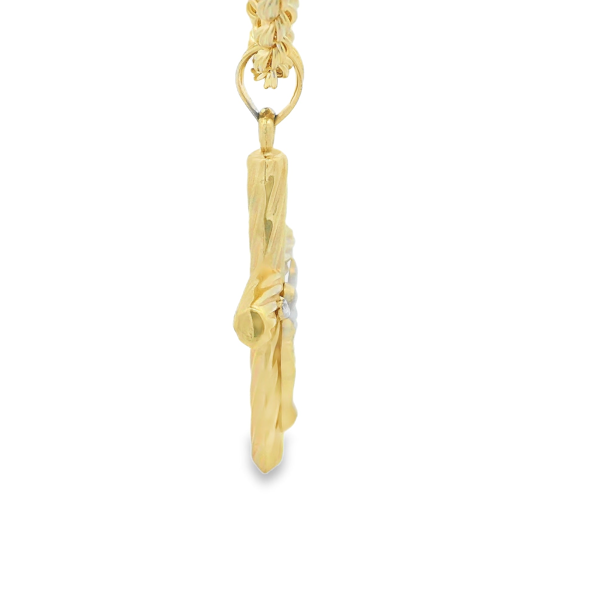 This stunning gold cross pendant features intricate detailing, showcasing a beautifully crafted figure. The combination of gold and silver tones adds a touch of elegance, making it a perfect accessory for both casual and formal occasions. Wear it as a symbol of faith or as a stylish statement piece.