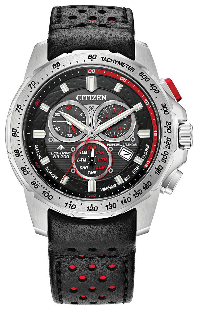 The Promaster MX is part of the Moto Series, designed for sport racing enthusiasts. Featuring strong design elements that evoke images of racing, this piece stands out with bold red color and perforated leather straps. The 43mm, stainless steel case houses features a chronograph, perpetual calendar and dual time zones. That’s all on top of using Eco-Drive technology, meaning it is powered by light — any light.
