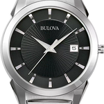 From the Classic Collection. In stainless steel with domed crystal, patterned black dial, calendar, second hand, and secure double-press fold-over clasp.