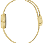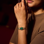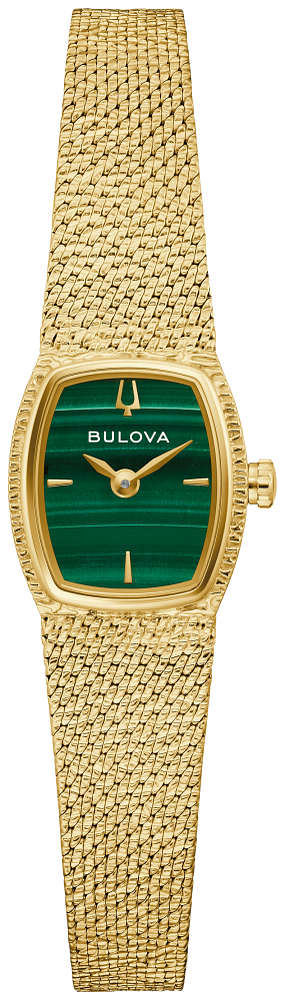 Step back in time to the glitz and glam of the 1970s with the Bulova women’s Classic “Goddess of Time” watch. Borrowing the timeless design of vintage Bulova “Goddess of Time” watches, the gold-tone stainless steel tonneau case has a textured top and a brightly polished bezel, seamlessly transitioning to a textured mesh bracelet and easily adjustable from 6″ to 7 ¾. Each striated green genuine malachite dial is completely unique and is appointed with gold-tone applied markers and matching hands, while Bulova’s Goddess of Time herself is etched onto the case back in intricate definition. Feel truly divine in this stunning Bulova ladies’ timepiece