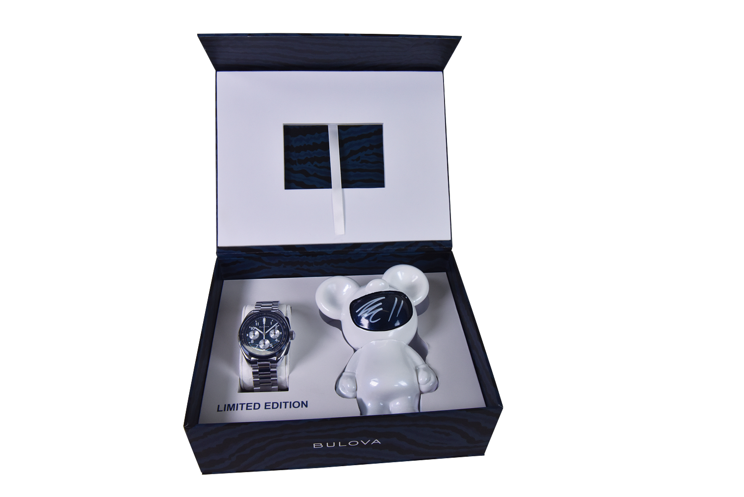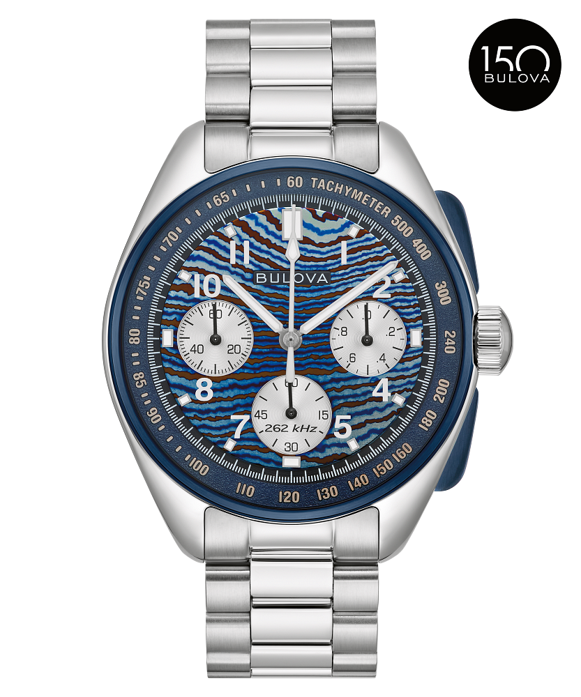 In collaboration with famed Brazilian artist Thiago Rosinhole, Bulova’s legendary Lunar Pilot chronograph is revisited for Bulova’s 150th Anniversary, combining Bulova’s legacy of precision timing with Rosinhole’s unique style of fusing street art and pop culture for this new limited-edition Lunar Pilot timepiece. Beneath the flat sapphire crystal, the watch takes a striking turn with a mesmerizing Timascus dial, crafted from titanium that has been folded through the Damascus process to achieve its captivating pattern. Slim, blue chronograph pushers and a crown featuring the Bulova tuning fork accent the 43.5mm silver-tone stainless steel case, while six-hand chronograph functionality with timing to 1/20th second, silver registers, and Super-Luminova applied to the hands and markers complement the dial’s blue tachymeter ring. Powered by our proprietary high-precision quartz movement, resonating at a frequency of 262khz for unparalleled accuracy and allowing a sweeping chronograph hand , the watch is paired with a matching 3-link silver-tone stainless steel bracelet and features an individually numbered case back embossed with Rosinhole’s signature Budii figure. A modern interpretation of a historic timepiece with a unique twist, the Bulova Lunar Pilot is the ideal watch for today’s explorer and is presented in special packaging, including a storybook and a signature 6-inch Budii figurine designed by the celebrated artist, exclusively for this collaboration. Limited to 5,500 pieces worldwide.