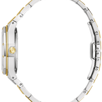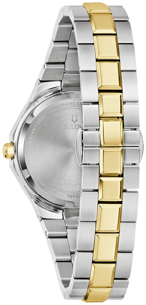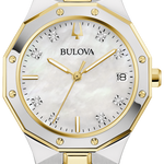 Bold, elevated design characterizes this Classic Bulova Prestige women’s timepiece that balances bold design with an elegant presence. The watch features a faceted 32mm gold- and silver-tone stainless steel case with a geometric bezel, flat sapphire crystal with anti-reflective coating, 100m of water resistance, and a chamfered 3-link bracelet with brushed and polished finishes and a push-button deployant closure. The lustrous mother-of-pearl dial has gold-tone hands and applied markers with Super-LumiNova luminescent fill, 8 dazzling diamonds, and a date display. Striking in both its modernity and its sophistication, this Bulova ladies’ watch is an ideal companion on any wrist.