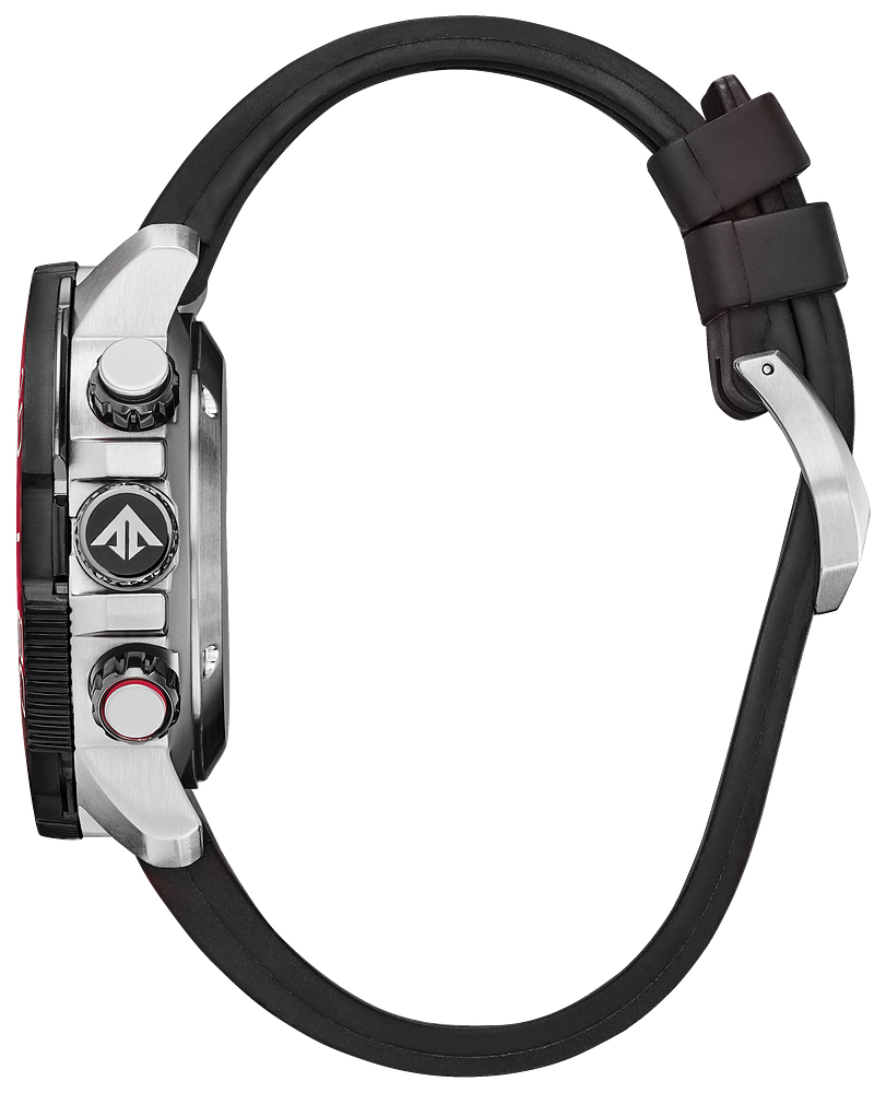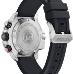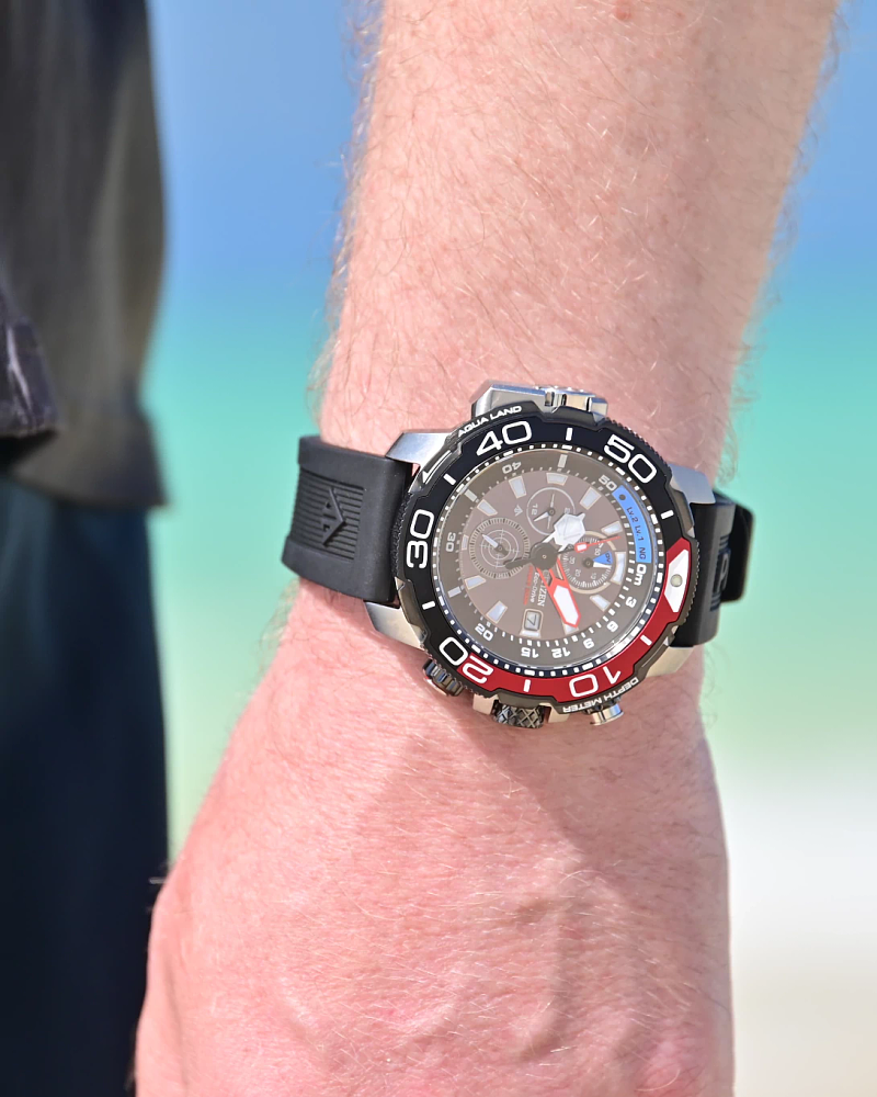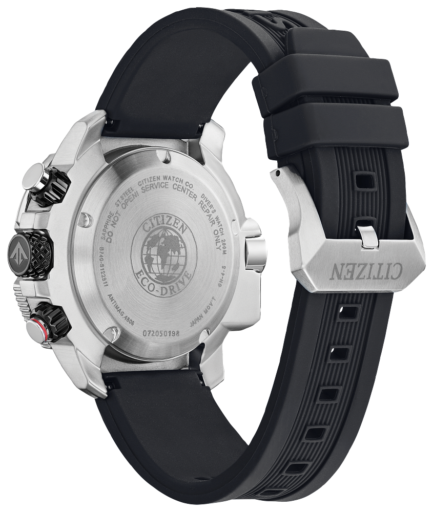 The powerful PROMASTER Aqualand from CITIZEN® has a black polyurethane strap, a stainless steel case coated with diamond-like carbon (DLC) accents, and a red accented black dial. This ISO compliant diver is packed with advanced features. It has water resistance up to 200M, making it perfect for everyday splashing around, or serious scuba diving. It also features a chronograph, 12/24-hour time, maximum depth memory, a power reserve indicator and screw-down crown and pushers. It also uses Eco-Drive technology, meaning it is powered by any light.