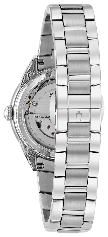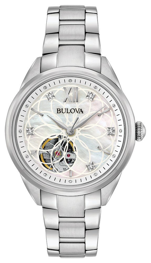 From the Rubaiyat Collection. Legendary heritage reinvented in gold-tone stainless steel case with synthetic blue spinel cabochon crown at 12 o’clock position and eight diamonds individually hand set on textured silver-white dial, double curved sapphire crystal, gold-tone stainless steel bracelet with double-press deployant closure, iconic dye struck “Goddess of Time” dimensional case back, and water resistance to 30 metres.