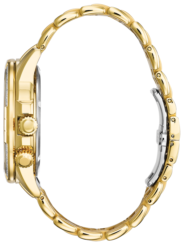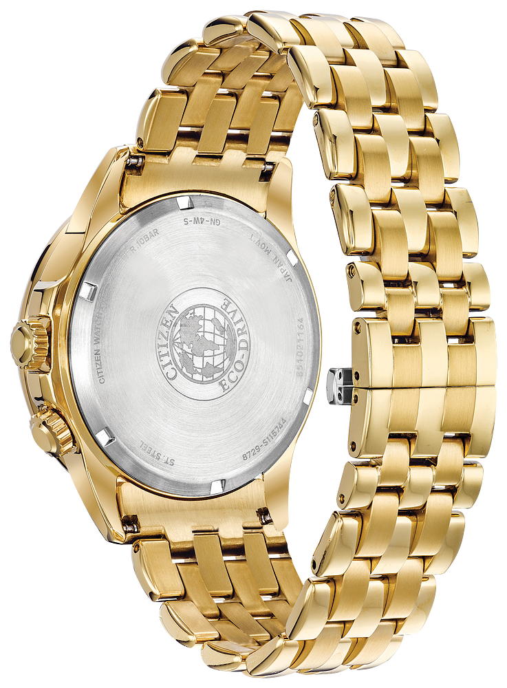 Bring sophistication to your day with the CITIZEN¨ Calendrier. This timeless watch features world time in 24 cities, 12/24-hour time, and day/date. It is shown here in a gold-tone stainless steel case and bracelet, with a diamond adorned bezel and black dial. Featuring our Eco-Drive technology Ð powered by light, any light. Never needs a battery.
