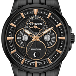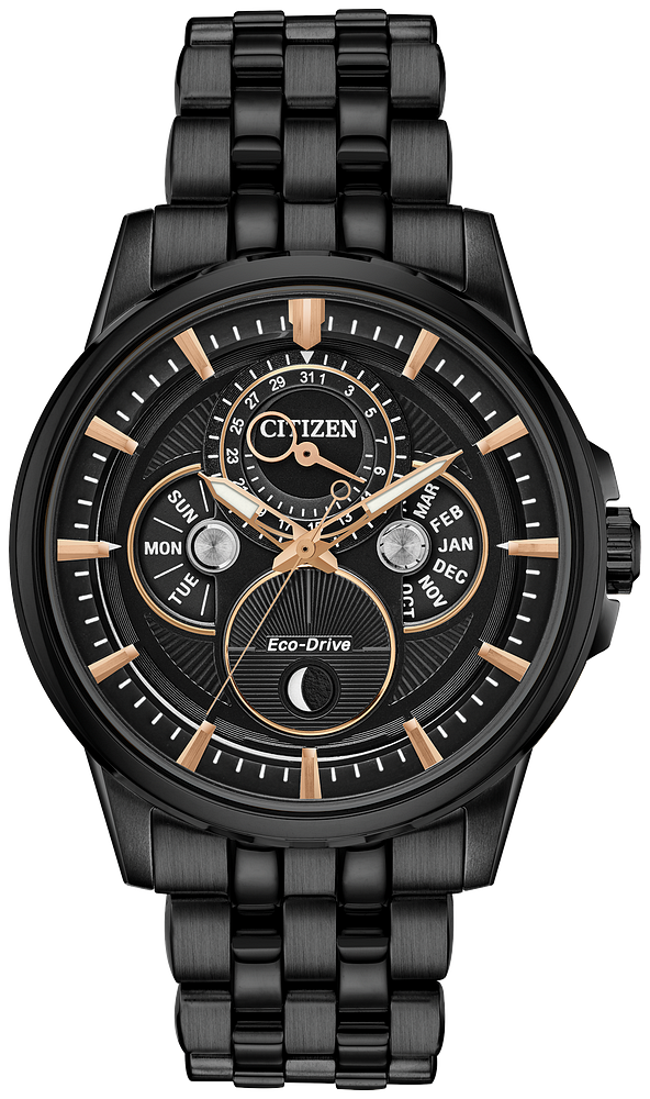 Bring sophistication to your day with the new CITIZEN® Calendrier Moonphase. This timeless watch features analogue month/day/date, and is shown in a black ion plated stainless steel case and bracelet with black dial. Featuring our Eco-Drive technology – powered by light, any light. Never needs a battery.