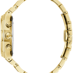 Bold, modern design characterizes this 6-hand chronograph from the Classic Bulova Prestige men’s collection. The watch features a faceted 40mm gold-tone stainless steel case with a geometric bezel, flat sapphire crystal with anti-reflective coating, 100m of water resistance, and a chamfered 3-link bracelet with a combination of brushed and polished finishes and a push-button deployant closure. The black textured dial with elegant striping has gold-tone hands and applied markers with Super-LumiNova luminescent fill, a date display, and gold-tone sub-dials including a 24-hour display. Highly functional with a distinctive design, this timepiece is suited for any occasion, from the everyday to the extraordinary.