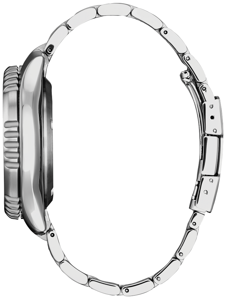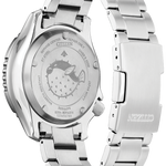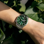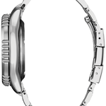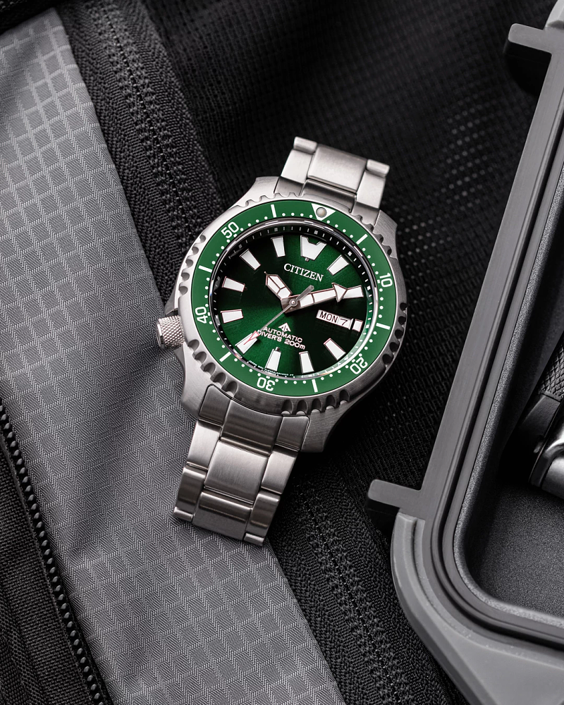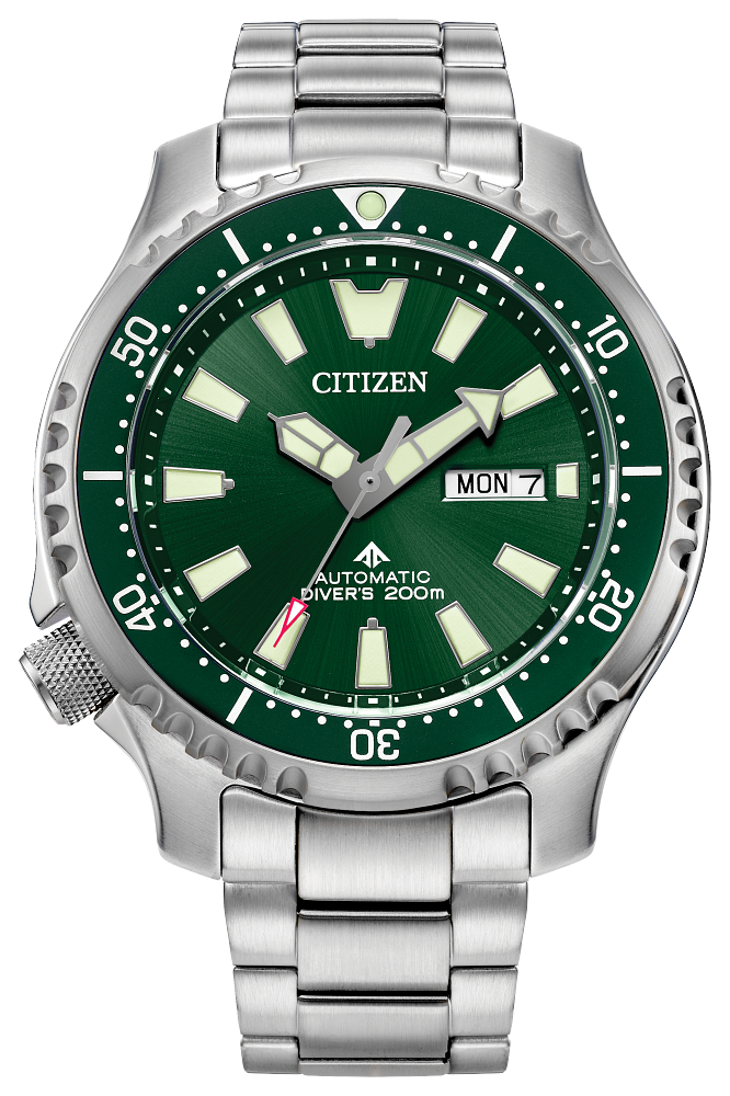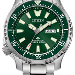 An iconic classic is reimagined in the polished style of the new Promaster Dive Automatic men’s watch by Citizen. Going deeper into the history of the original version of this diving watch, it was used by the Italian Navy and released in 1989 for the new generation of dive watch enthusiasts. Featuring a 3-piece, 44mm case, sapphire crystal and a silver-tone stainless steel case and bracelet. The green rotating bezel with easy-grip aluminum ring surrounds the green dial and luminous hands and markers. This technically advanced and stylish sport watch comes in an exclusive collector’s dive tank box and is ISO compliant with a screw-down crown and water resistant to 200 metres. Calibre 8204.