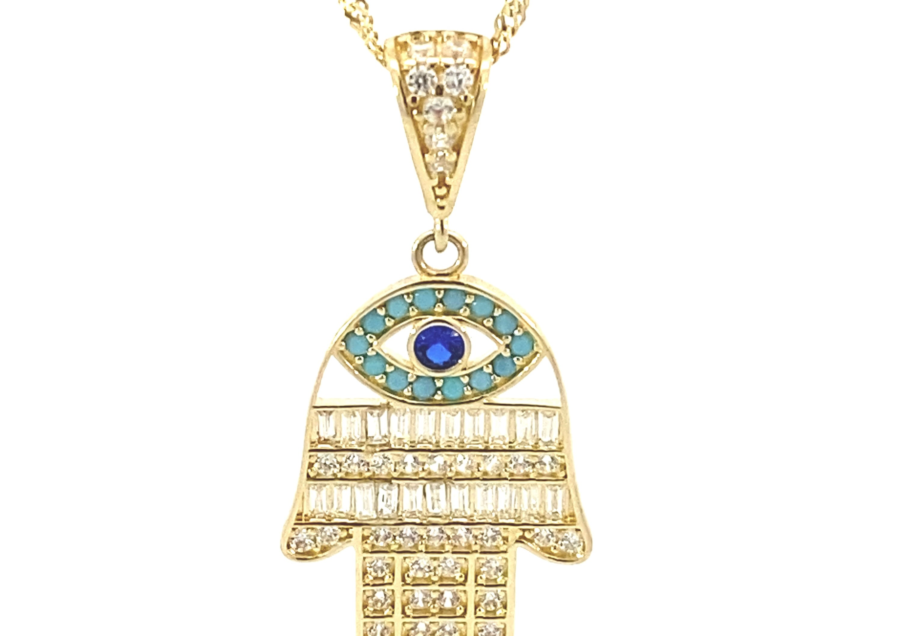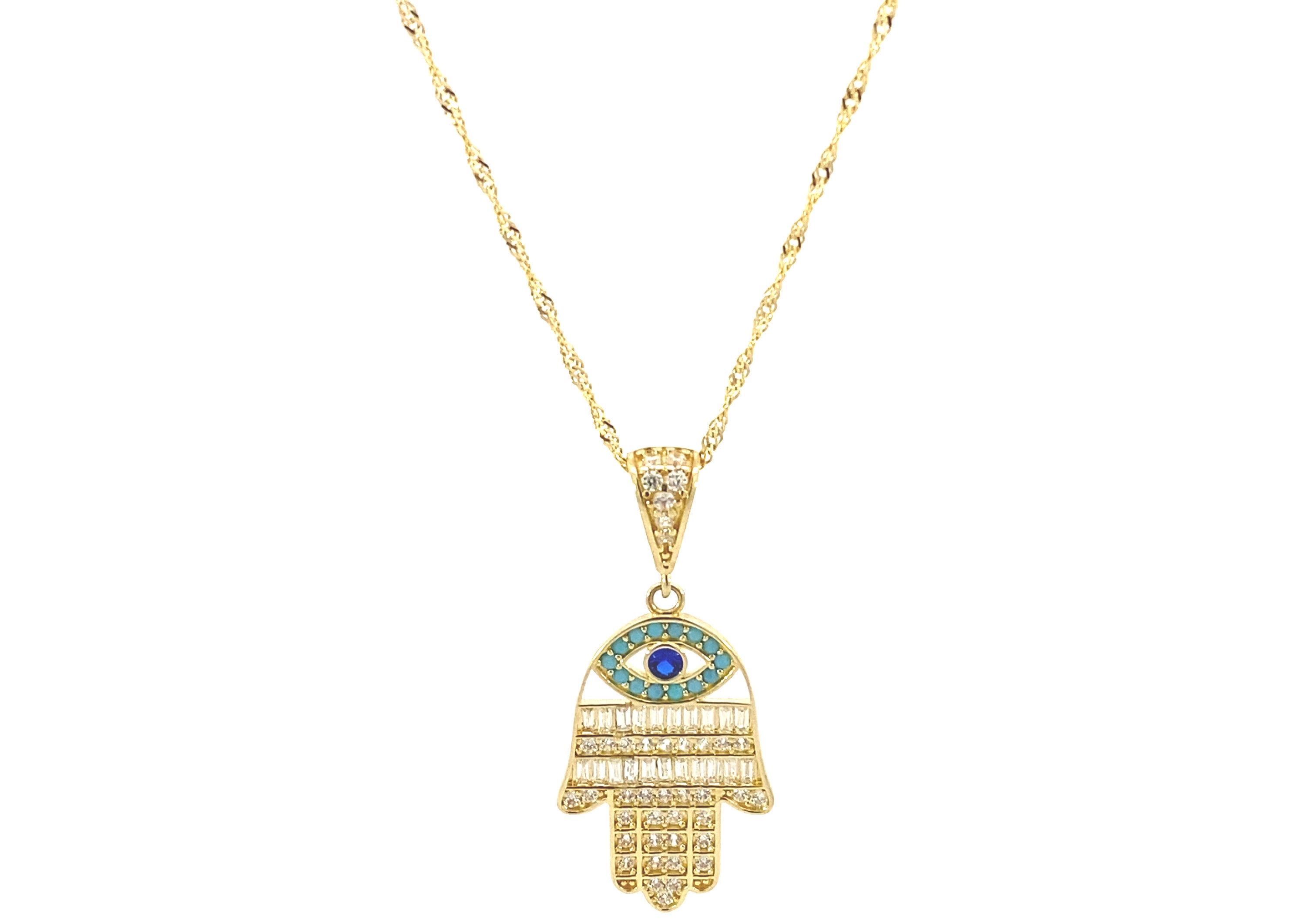 Hamsa Crystal Evil Eye Necklace 10K Gold