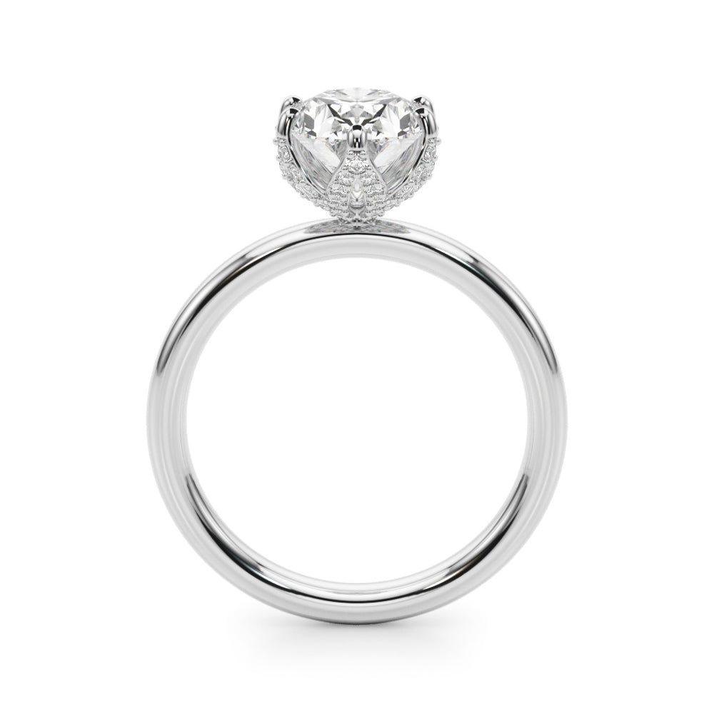 Parez votre main d'élégance et de sophistication avec la bague de fiançailles Fiora en diamant ovale. Ce sublime solitaire arbore un motif caché sous le magnifique diamant ovale, ajoutant une touche de mystère à son allure déjà luxueuse. Admirez la beauté de cette bague et le secret qu'elle recèle.