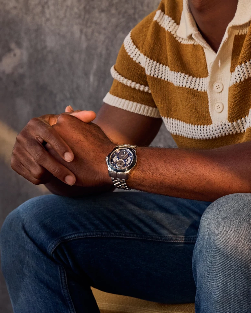 Apportez une touche de sophistication à votre quotidien avec la nouvelle montre Calendrier. D'un style avant-gardiste, cette montre tournée vers l'avenir arbore un diamètre de 41,8 mm et est fabriquée en acier inoxydable argenté. Sa couronne encastrée, sa lunette bleue et son bracelet en acier inoxydable à cinq maillons lui confèrent une allure distinguée. Son cadran multidimensionnel affiche des indicateurs analogiques pour le mois, le jour et la date, ainsi qu'un indicateur des phases de lune à 6 heures. Les tons bleu profond, blanc, argent et gris accentuent son charme. Cette montre pour homme est dotée de la technologie Eco-Drive exclusive de Citizen : elle fonctionne de manière durable grâce à la lumière, quelle que soit la source lumineuse, et ne nécessite aucune pile. Étanche jusqu'à 100 mètres. Calibre 8730.