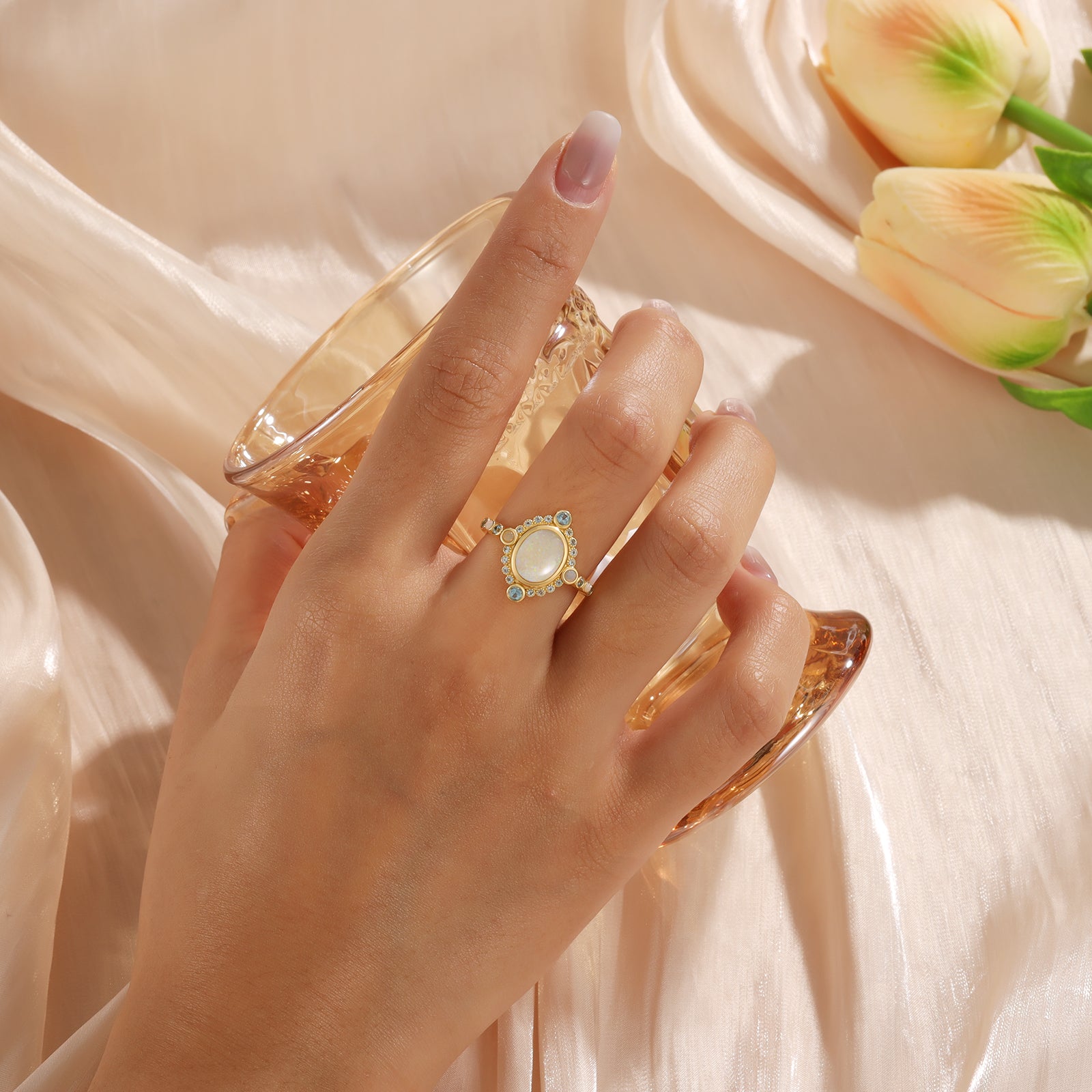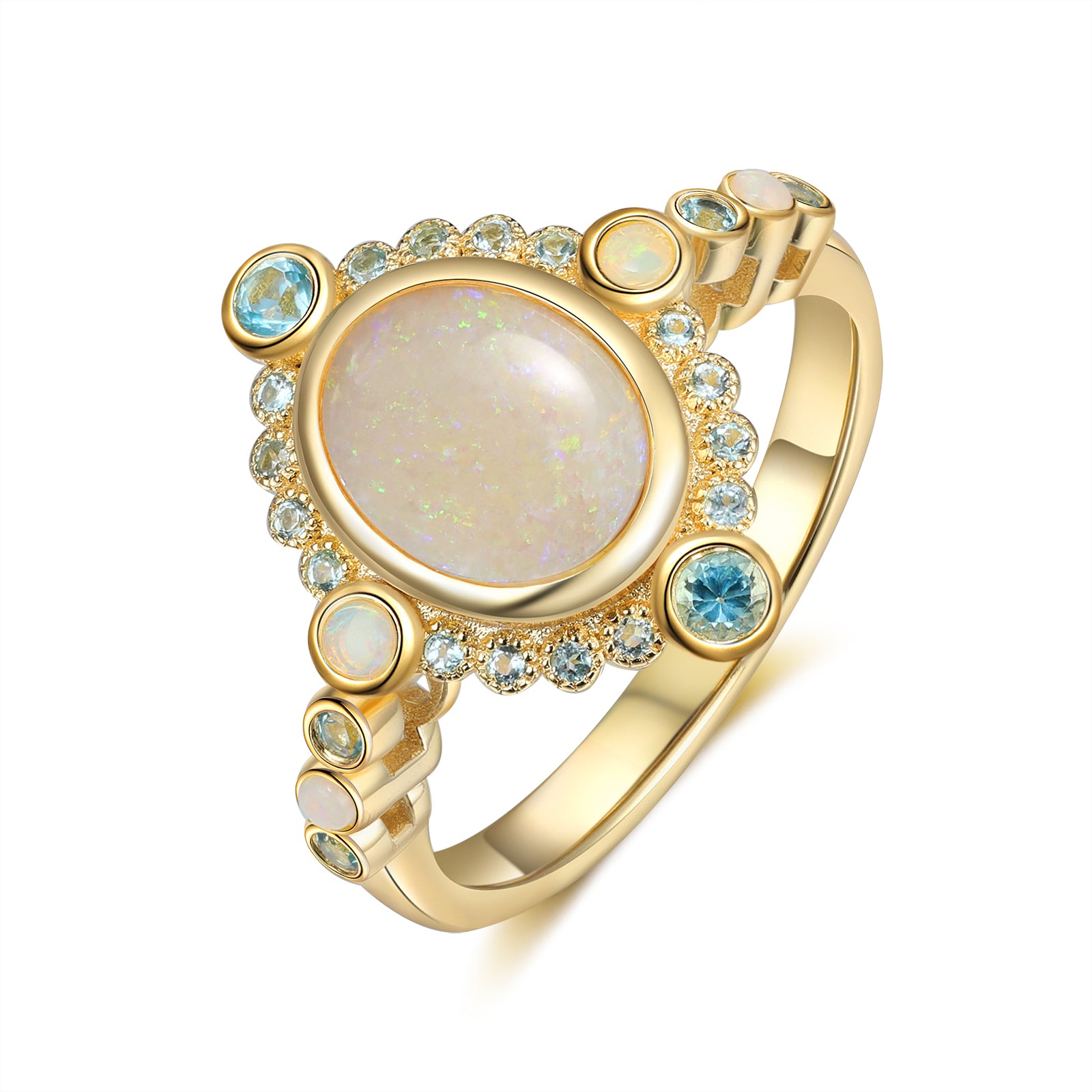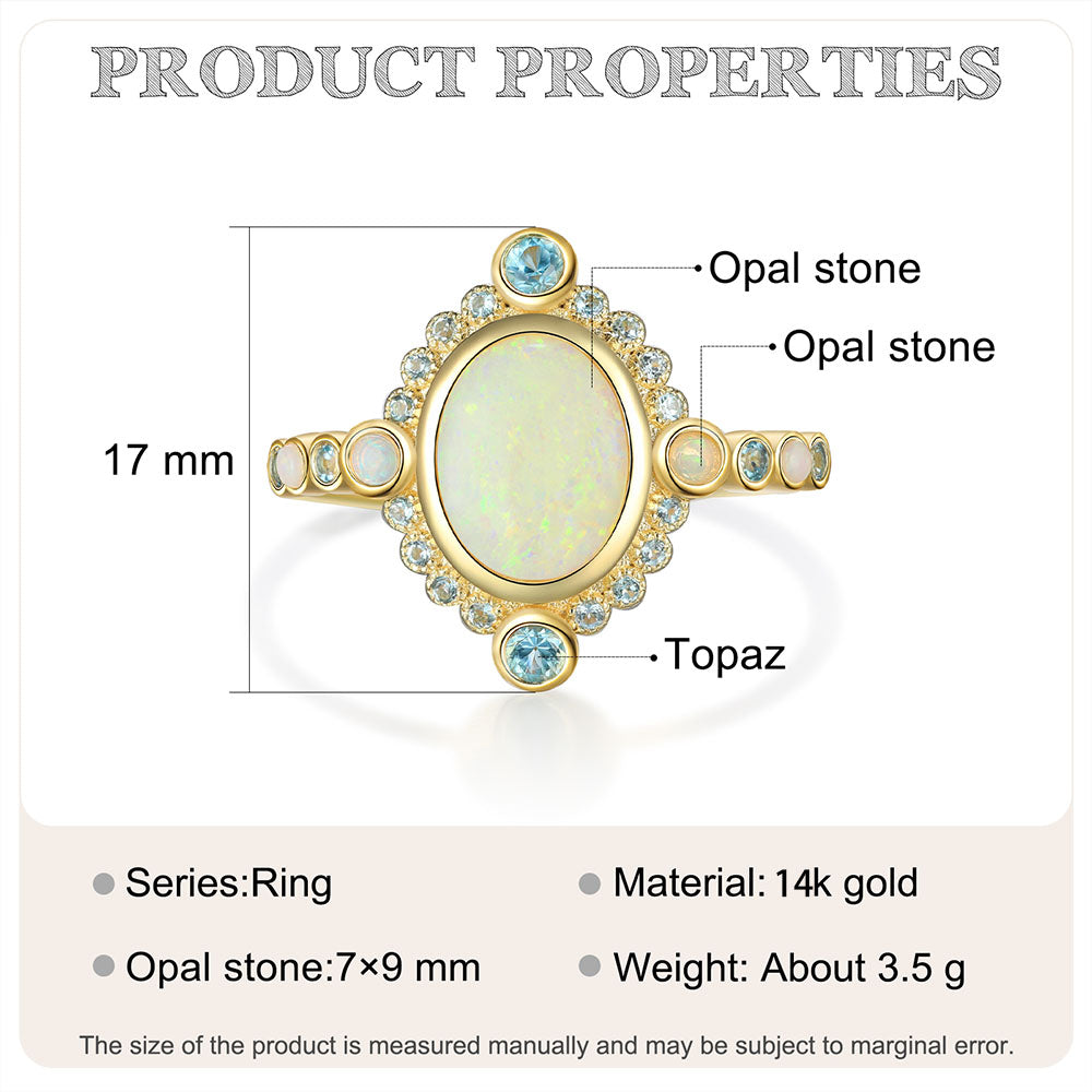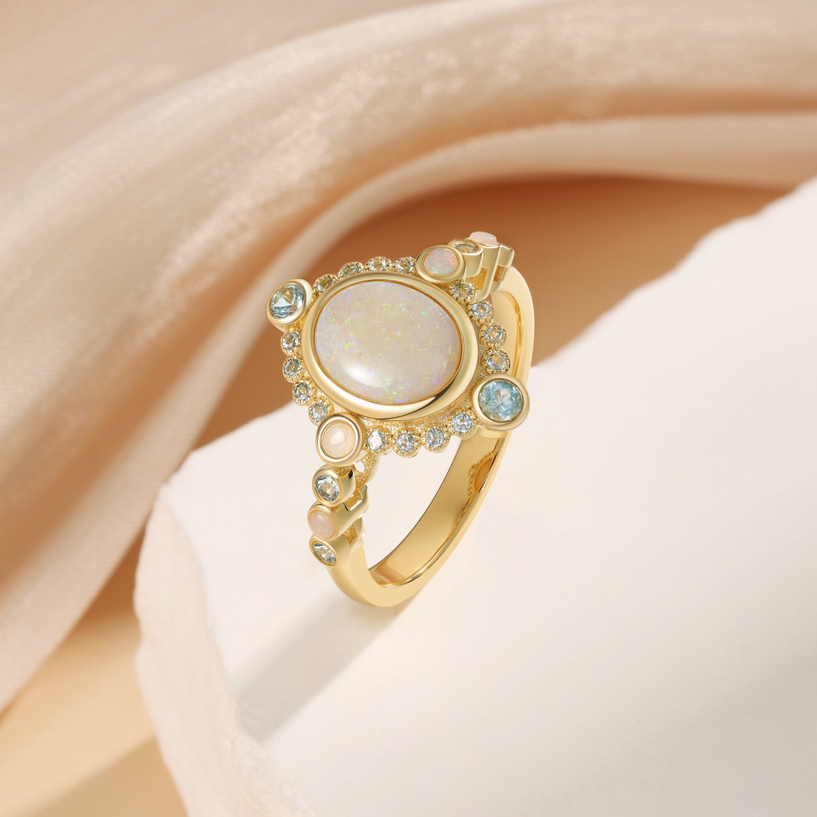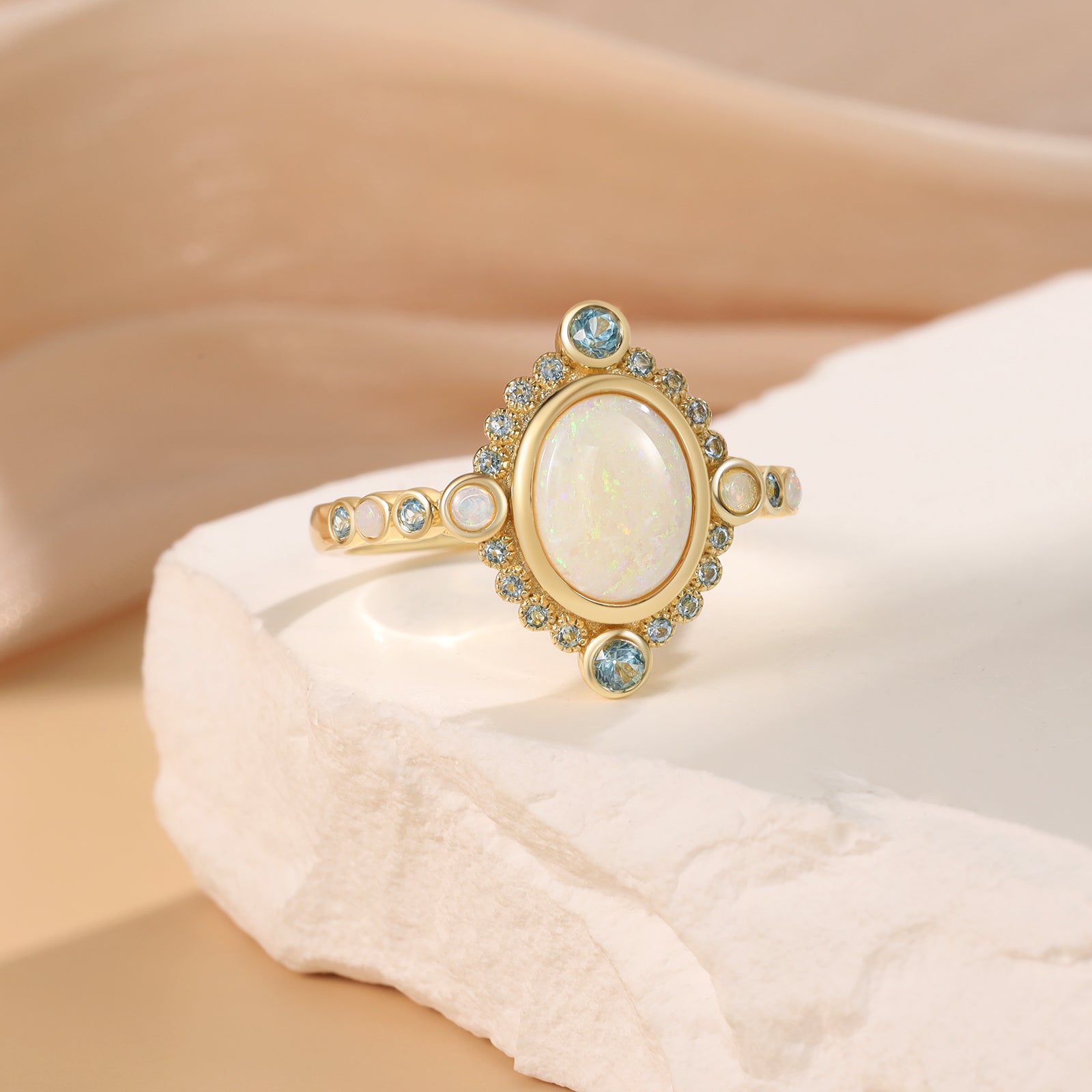 Ornée d'une magnifique opale naturelle en son centre et rehaussée de topazes bleues, cette bague est un bijou exceptionnel. Les opales sont réputées pour leur jeu de couleurs unique et irisé, faisant de chacune d'elles un trésor unique. La topaze bleue, avec sa teinte bleue éclatante, offre un magnifique contraste et complète parfaitement l'opale, créant ainsi une pièce véritablement accrocheuse. Qu'elle soit portée comme pièce maîtresse ou pour une occasion spéciale, une telle bague fera sensation et sera chérie pendant des années. Matériaux disponibles : or 18 carats/or 14 carats.