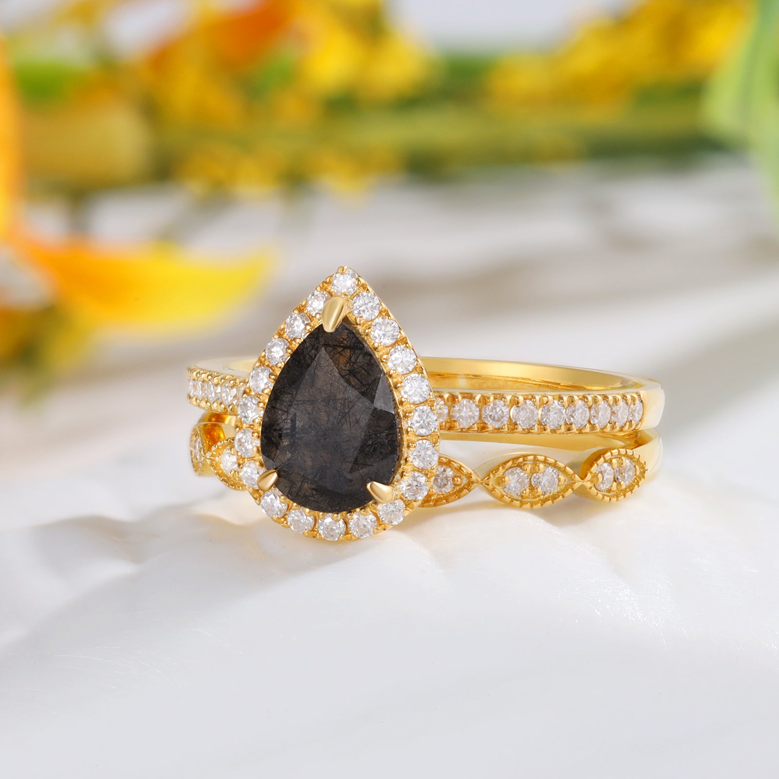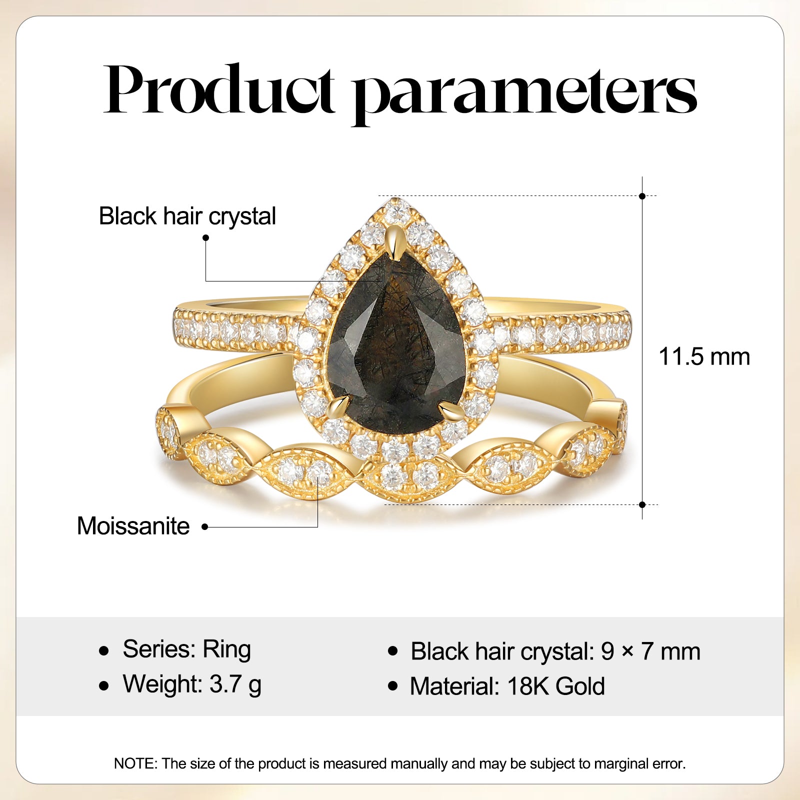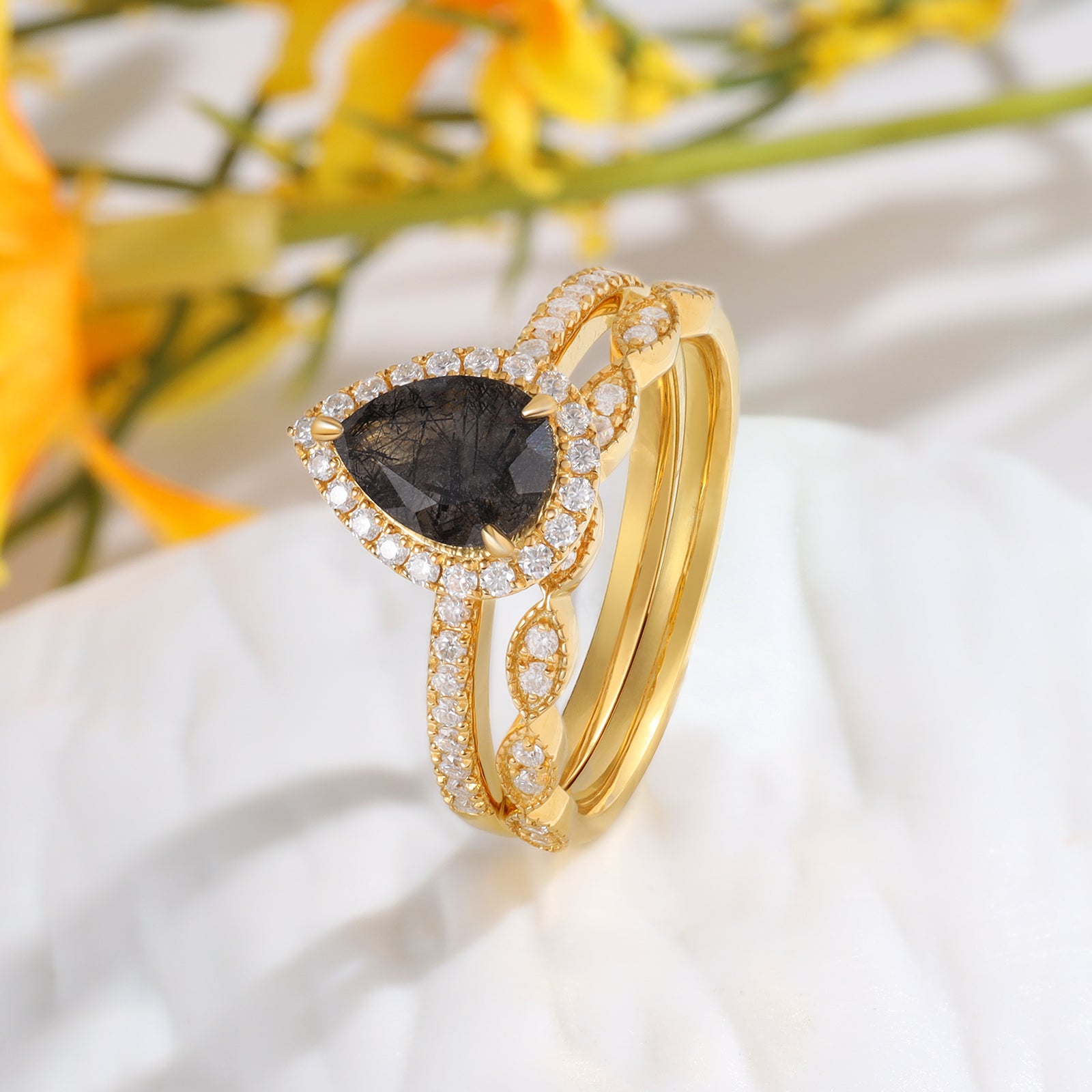 Matériau : Disponible en or 18 carats ou 14 carats - La pierre du milieu est un cristal de cheveux noir - les petites pierres sont de la moissanite.