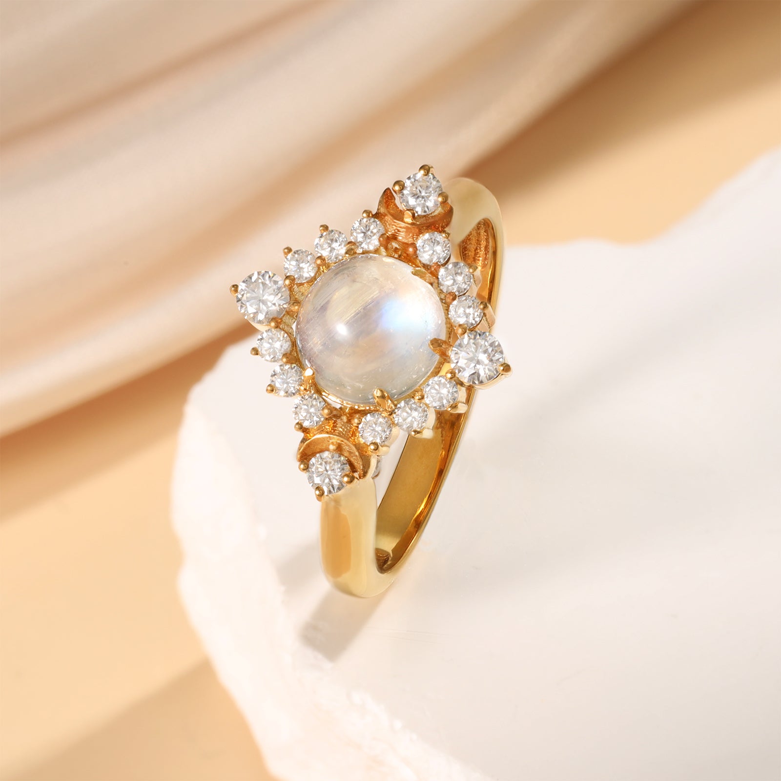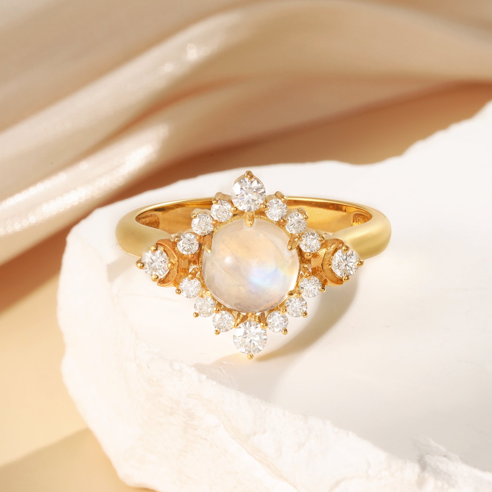Matériau : Disponible en or 18 carats ou 14 carats - Pierre du milieu : Pierre de lune - les petites pierres sont de la moissanite.