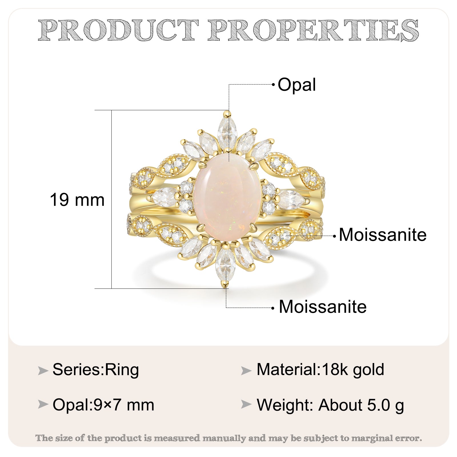 Matériau : Disponible en or 18 carats - Pierre d'opale et Moissanite Pierres. Qu'est-ce que la moissanite ? La moissanite est une pierre imitant le diamant, fabriquée en carbure de silicium . Une imitation de diamant est une pierre qui ressemble à un diamant, mais qui n'en est pas un. Il est très difficile de distinguer un diamant de la moissanite, ce qui fait de la moissanite une alternative courante au diamant.