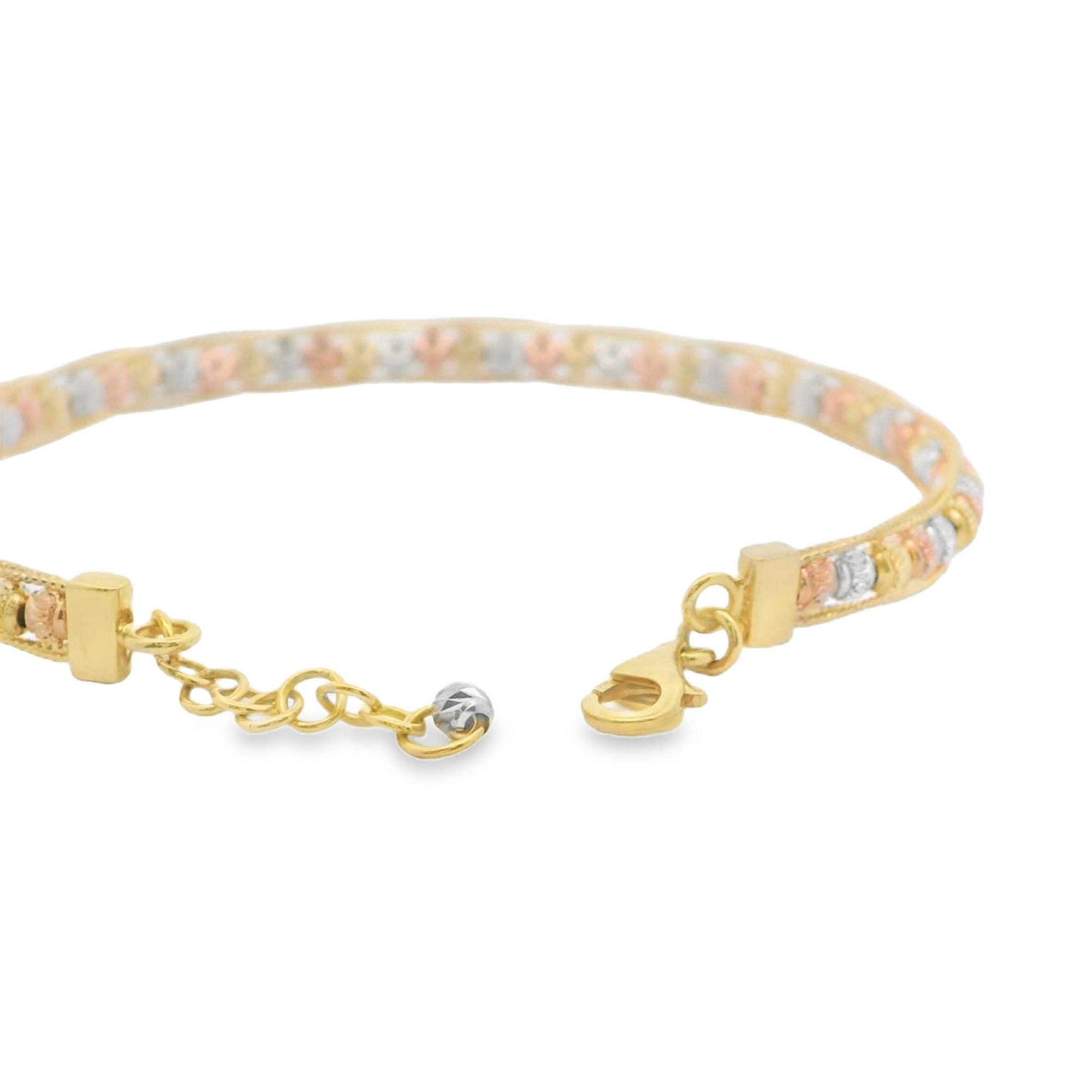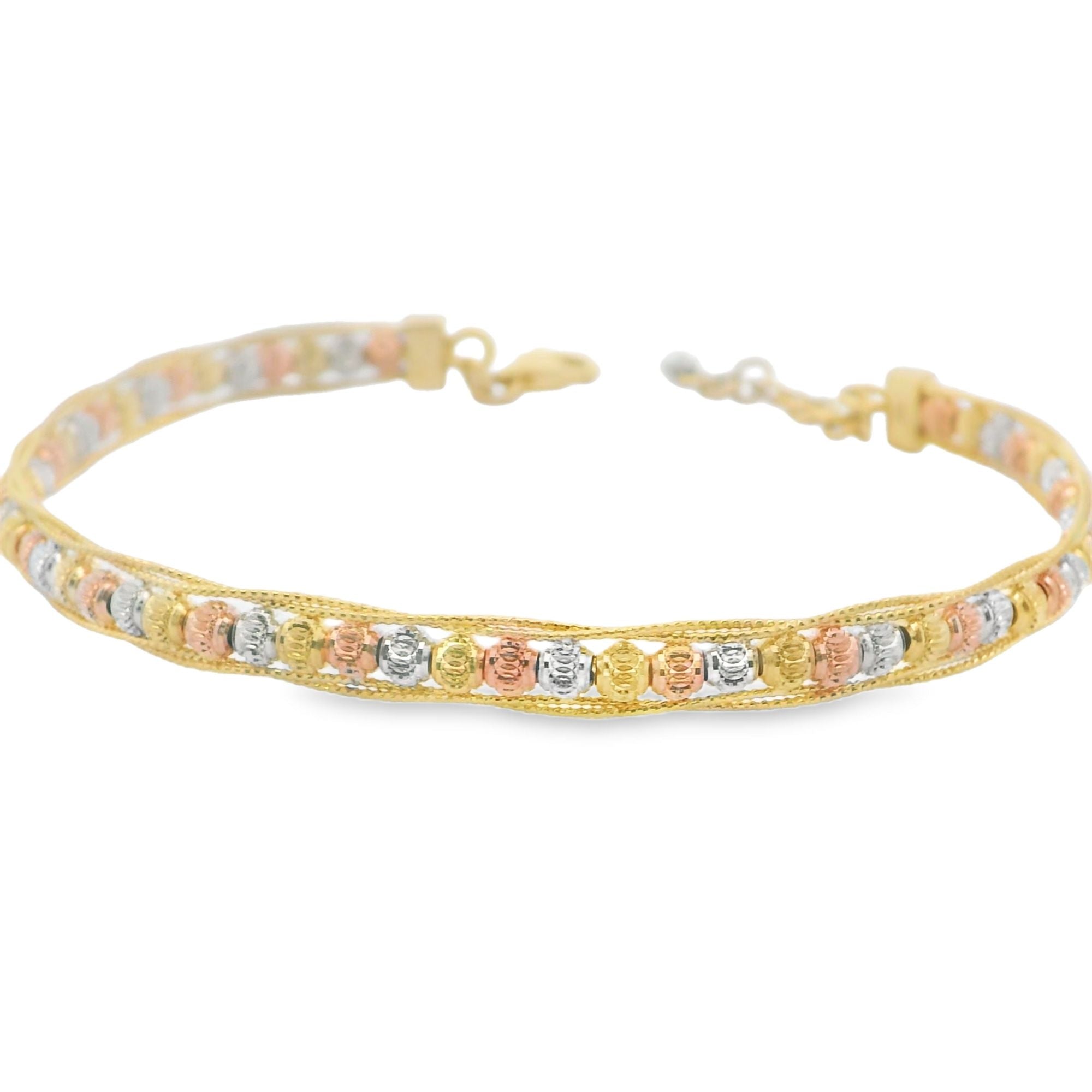 Ce bracelet raffiné présente un mélange harmonieux d'or jaune, rose et blanc, créant un effet tricolore saisissant. Chaque maillon est méticuleusement travaillé pour refléter la lumière, ce qui en fait un accessoire parfait en toute occasion. Son design élégant, à la fois intemporel et polyvalent, apporte une touche de sophistication à toutes les tenues.