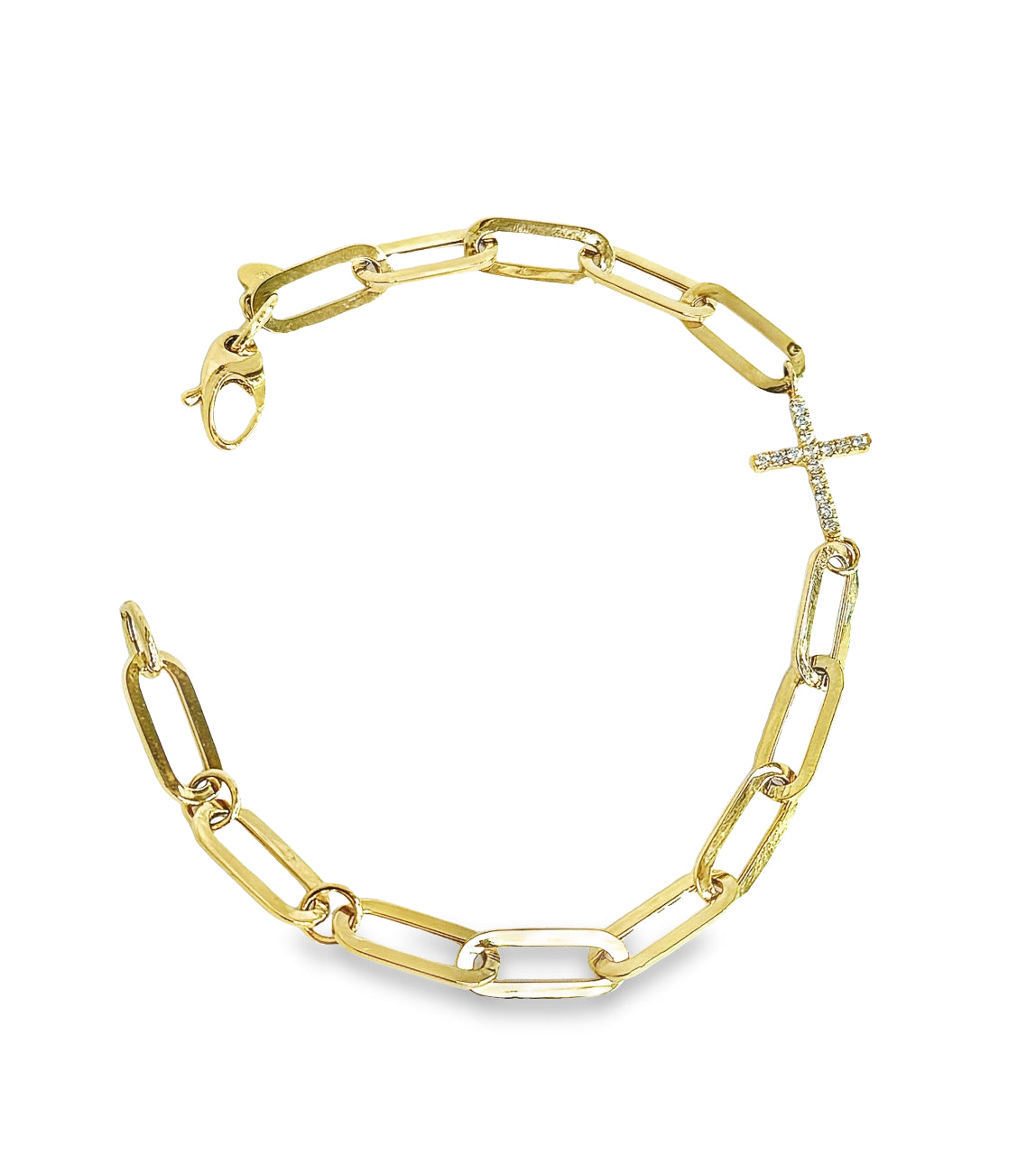 Ce bracelet trombone en or 18 carats est orné d'une breloque croix en diamant étincelant au centre, ajoutant une touche d'élégance et de sophistication à votre tenue. Sublimez votre style avec ce superbe bijou et faites-en un symbole de foi et d'amour.