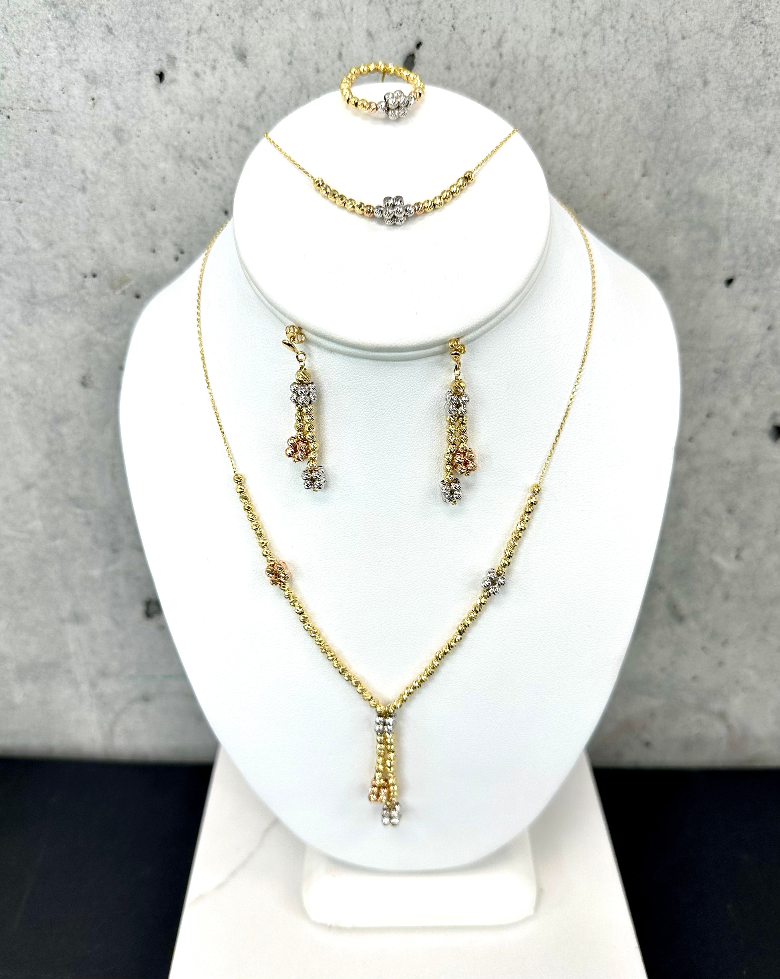 - L'ensemble comprend : boucles d'oreilles, bague, collier et bracelet