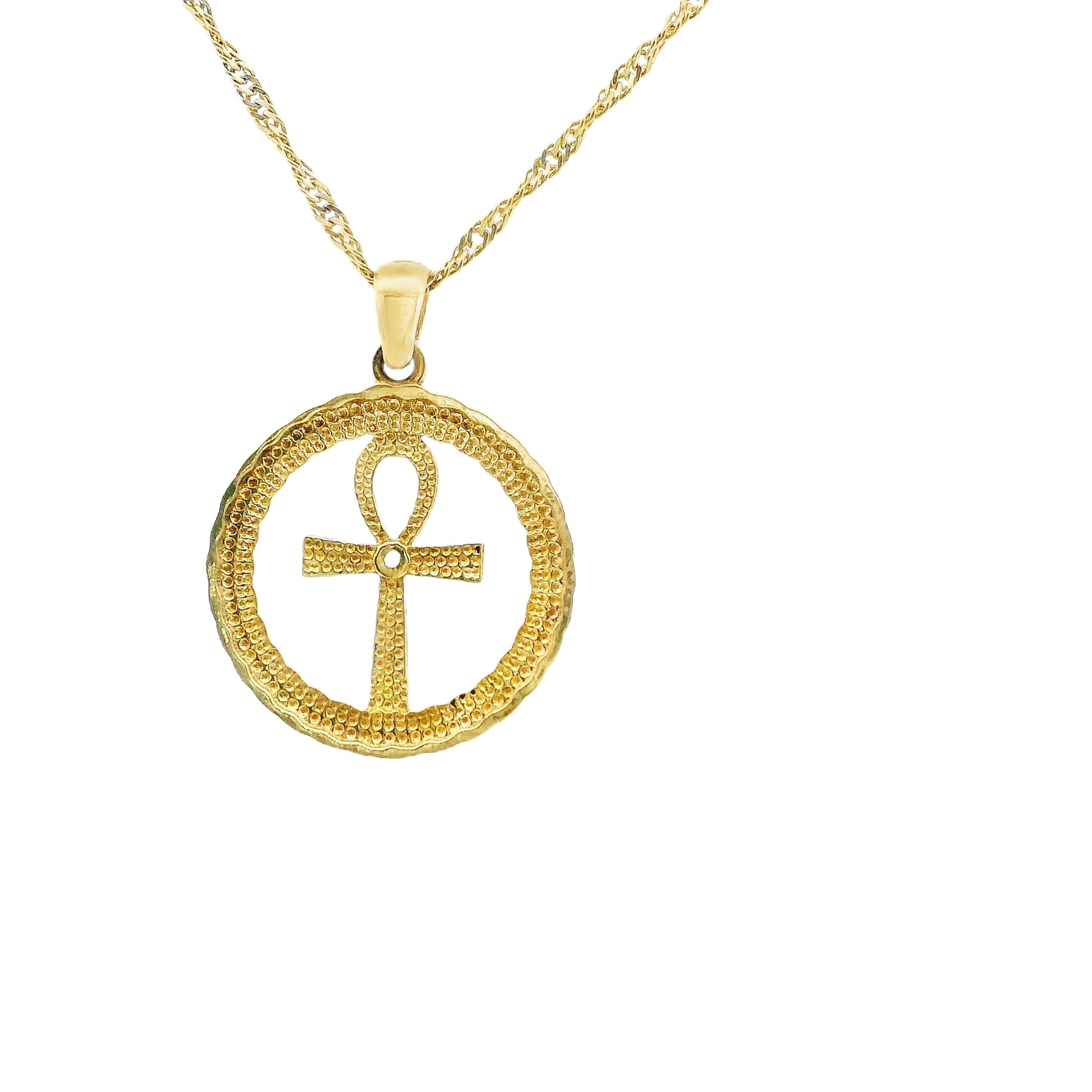 Ce superbe collier pendentif Ankh allie élégance intemporelle et touche de spiritualité. Orné de détails raffinés, il arbore un symbole Ankh classique entouré d'une corde torsadée, un accessoire idéal en toute occasion. Sa chaîne dorée lui confère une finition luxueuse et vous permettra de vous démarquer où que vous alliez.