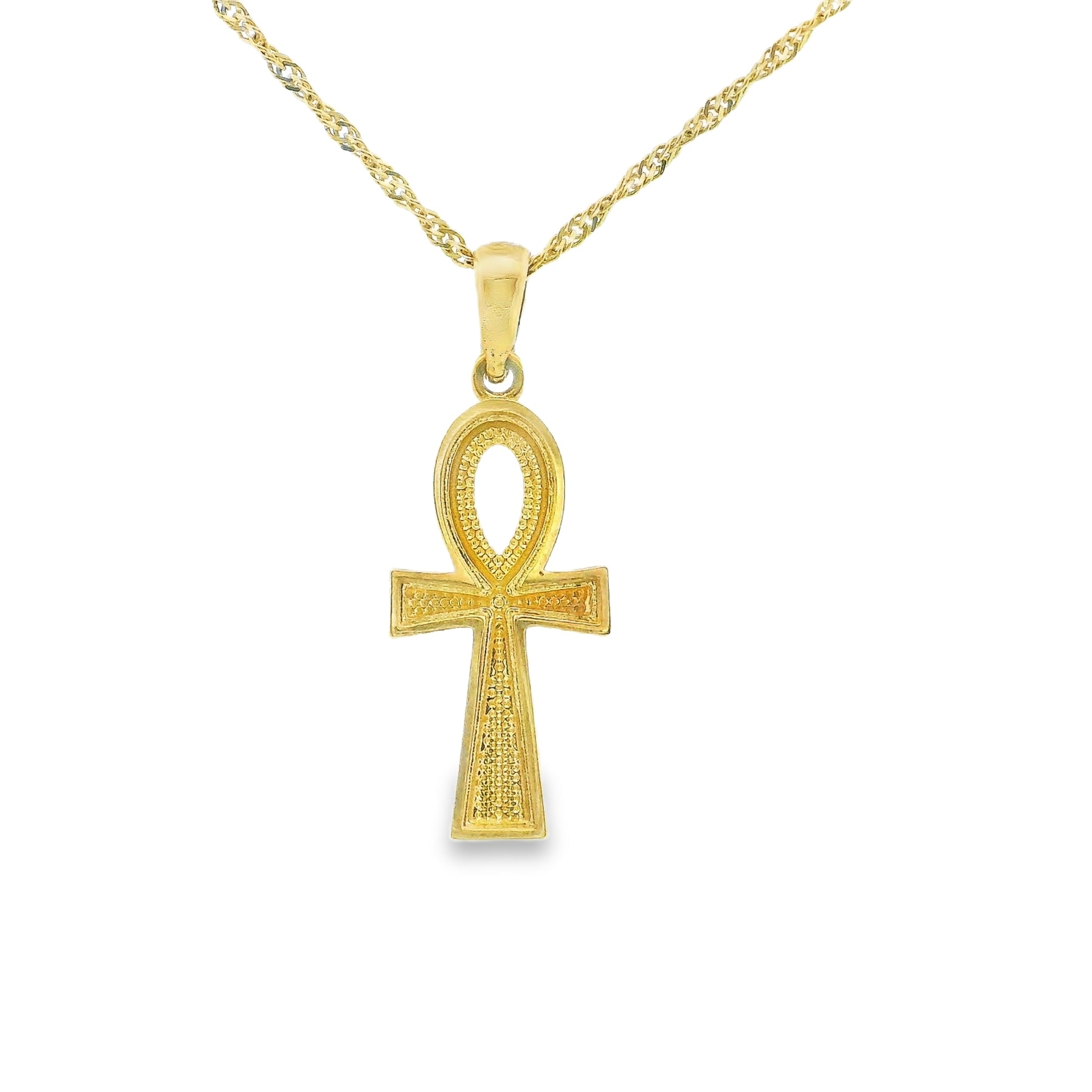 Ce pendentif Ankh en or 10 carats, au style Kan distinctif, allie le symbolisme de l'Égypte ancienne à un savoir-faire contemporain. Le symbole hiéroglyphique de la vie est rendu avec précision et proportions harmonieuses.
