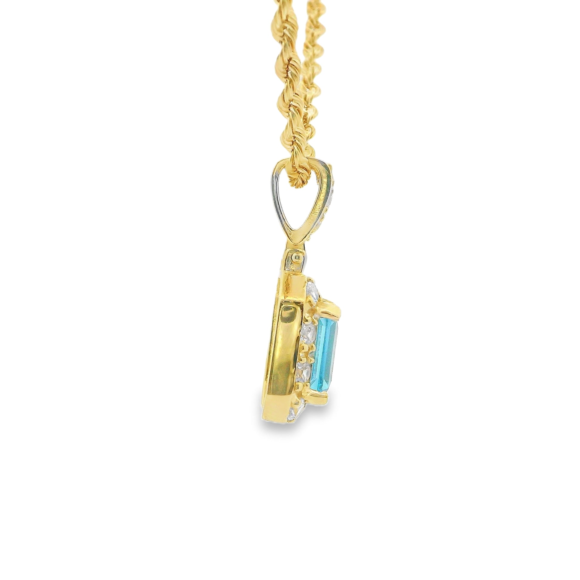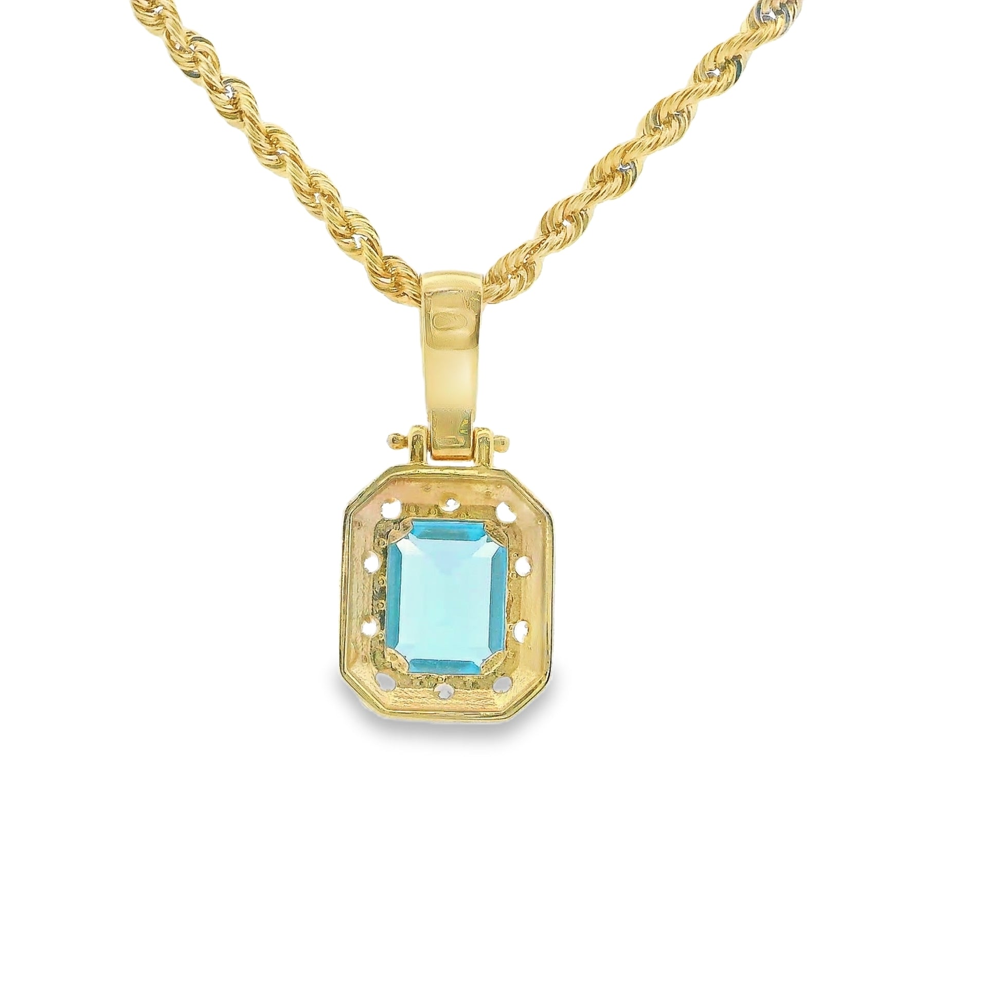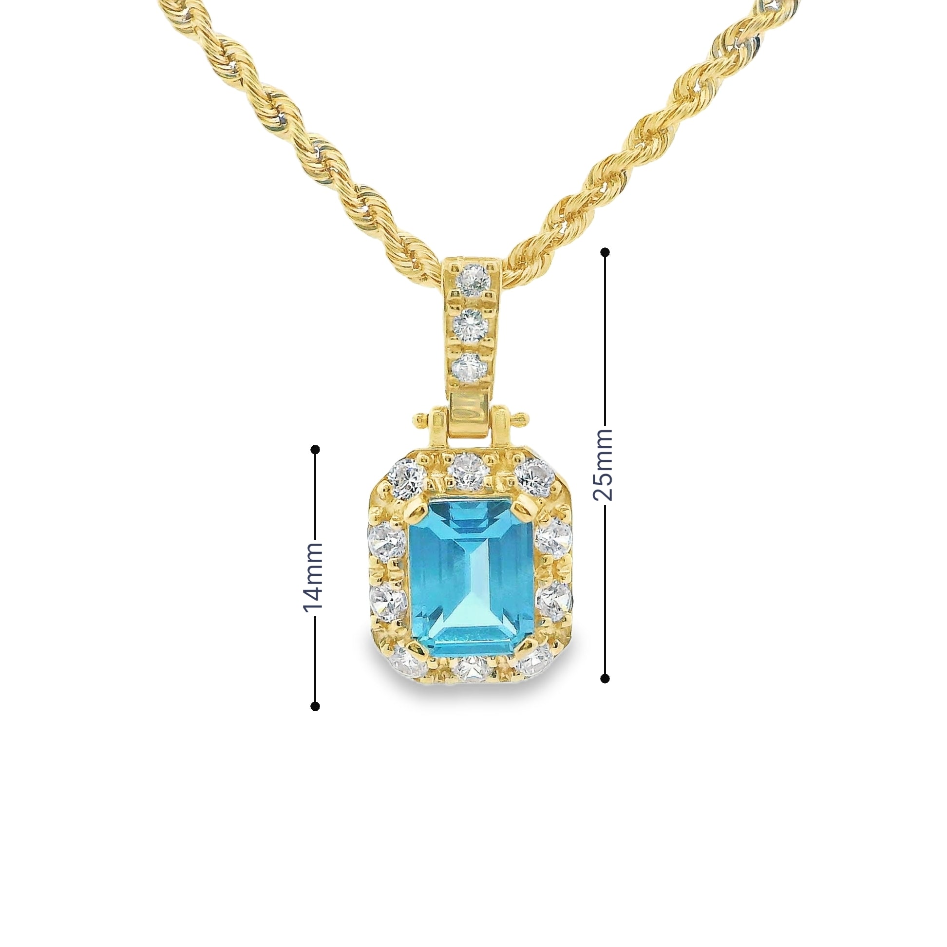 Ce pendentif en or est orné d'une pierre précieuse taille émeraude, caractérisée par sa forme rectangulaire aux angles coupés. La pierre centrale, de la couleur de votre choix, est entourée d'un halo de zircones AAA taille brillant rond, qui rehausse son attrait visuel. Le pendentif est suspendu à une chaîne en or Rope, qui complète parfaitement le design. Sa fabrication témoigne d'un savoir-faire artisanal de haut niveau, avec une attention particulière portée aux détails du sertissage et des finitions.