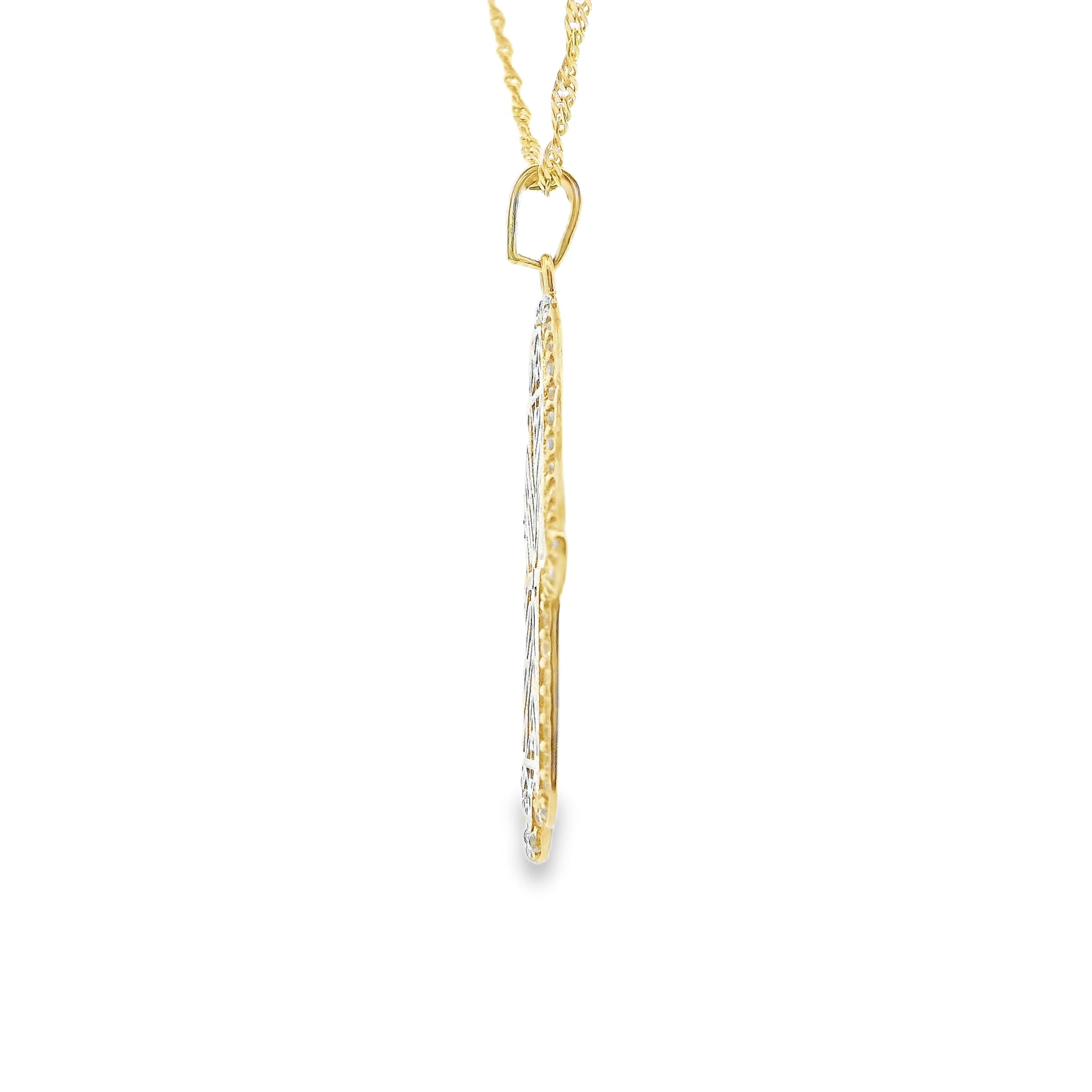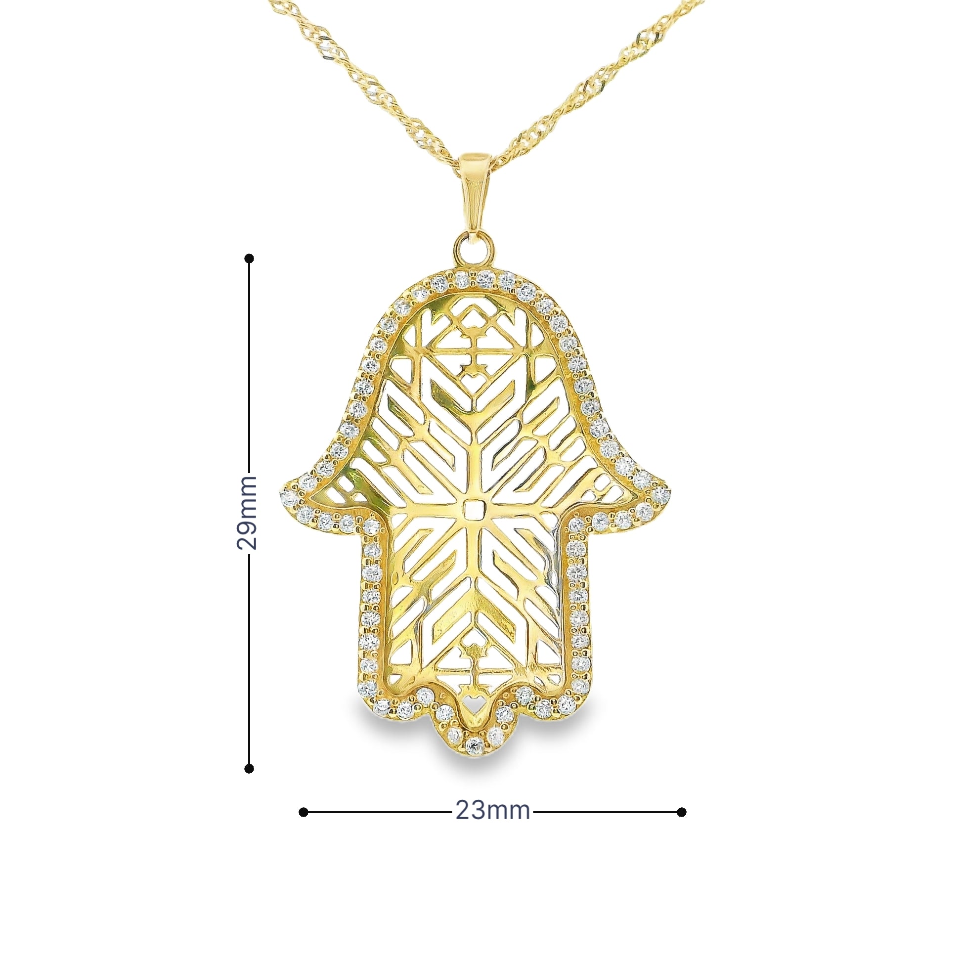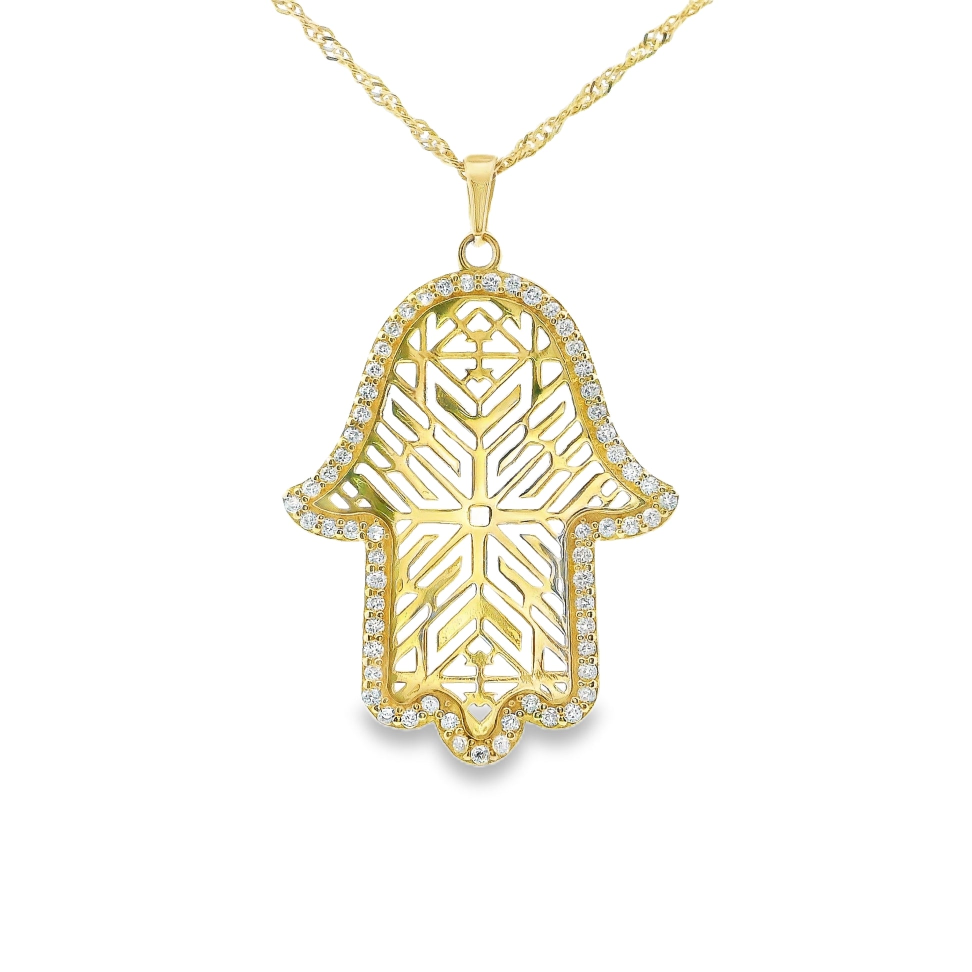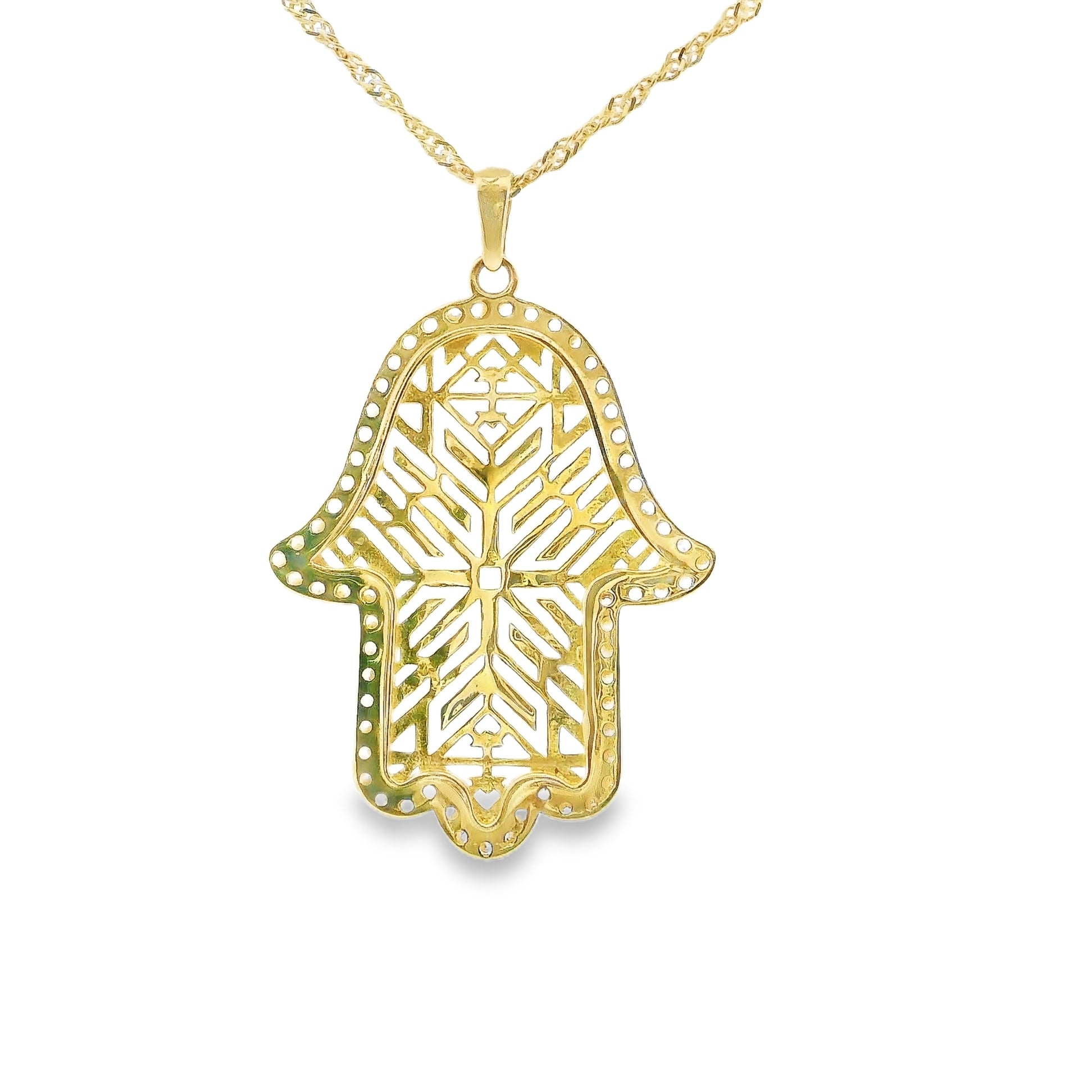 Ce superbe collier pendentif Hamsa en or allie à la perfection élégance et signification culturelle. Orné de pierres étincelantes, il symbolise la protection et la chance, ce qui en fait un cadeau idéal pour vos proches ou pour vous-même. Son design raffiné et ses détails chatoyants lui confèrent une allure remarquable dans toute collection de bijoux.