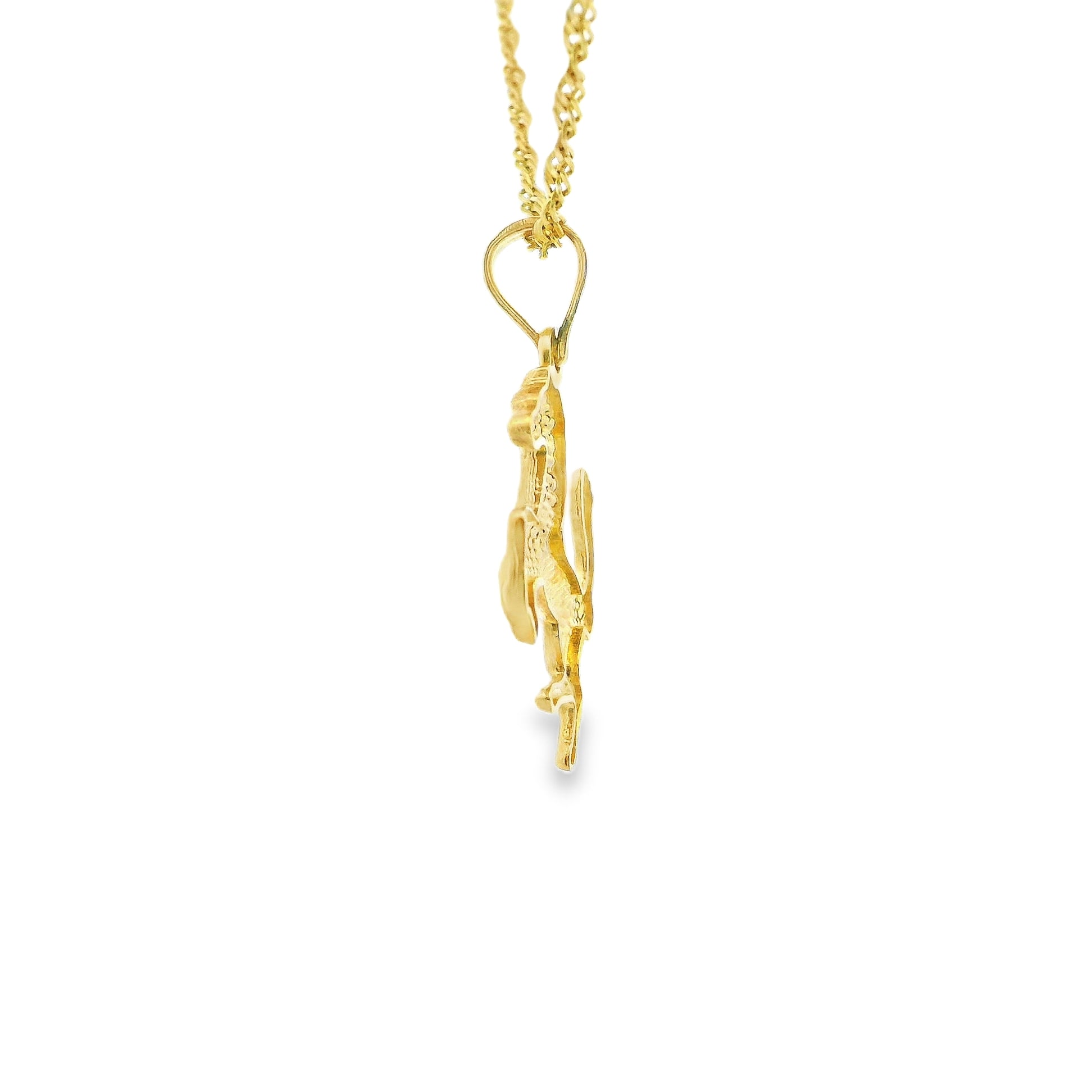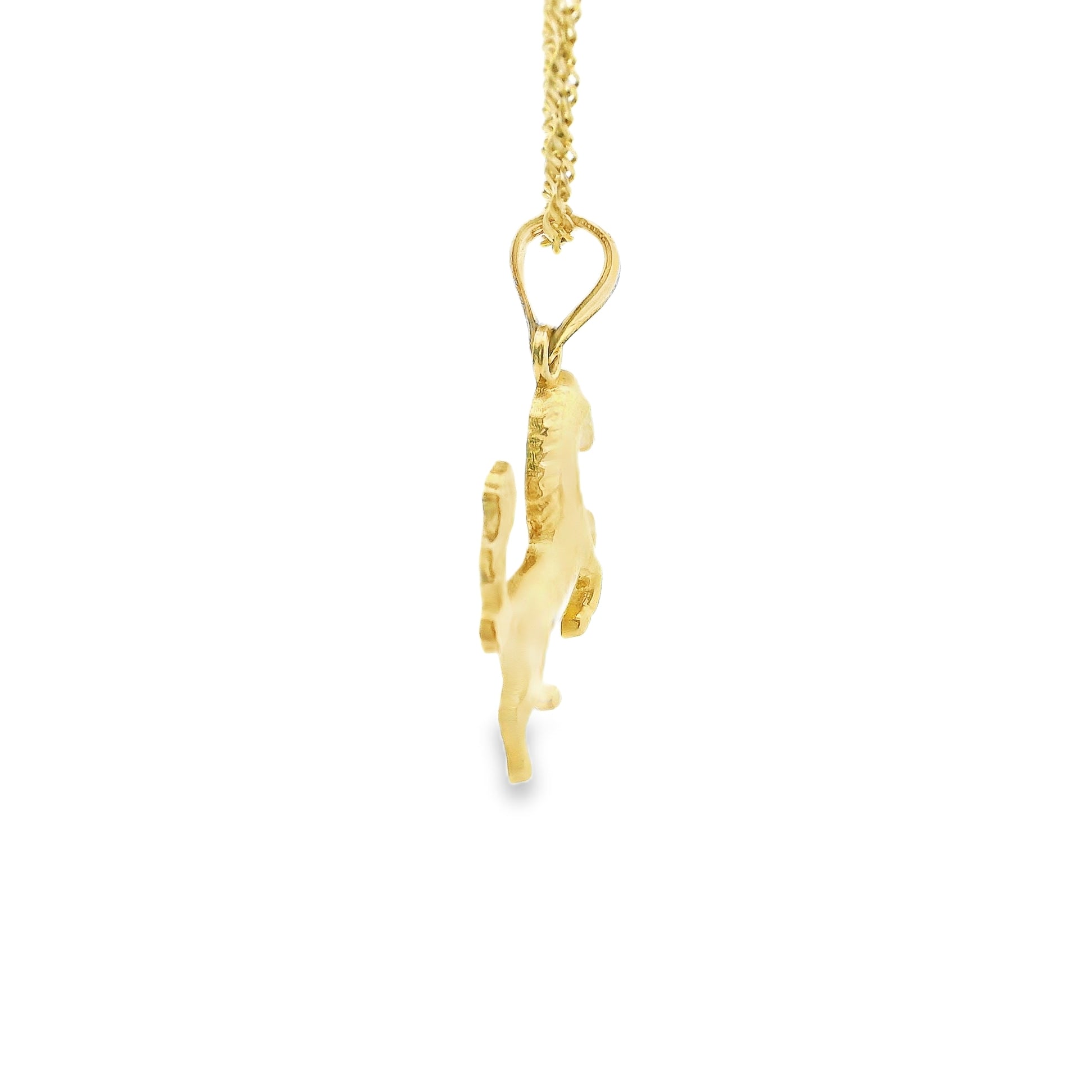 Ce pendentif cheval en or 10 carats est doté d'un savoir-faire artisanal et de détails raffinés qui en font une pièce intemporelle. Son design délicat capture la grâce et la beauté d'un jeune cheval, ce qui en fait l'accessoire idéal pour tout amateur d'équitation. Fabriqué avec des matériaux de haute qualité, ce pendentif apporte une touche sophistiquée à toutes les tenues.