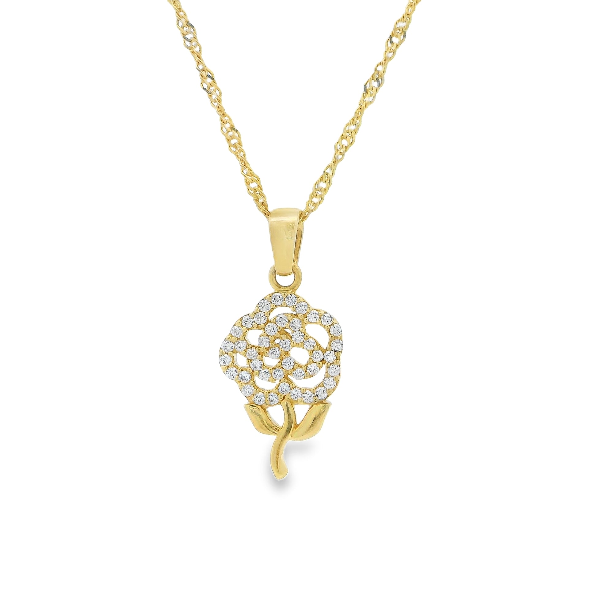 Offrez-vous le luxe avec notre pendentif Fleur en or 10 carats. Son design élégant est sublimé par l'éclat des zircones cubiques, qui lui confèrent une élégance supplémentaire. Sublimez n'importe quelle tenue avec cet ajout raffiné et exclusif à votre collection de bijoux.