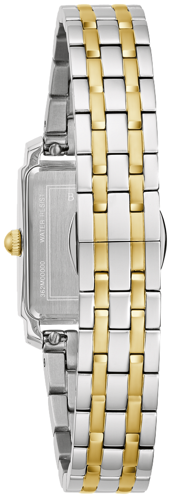 Cette toute nouvelle montre femme Bulova ajoute un style nouveau à la déjà impressionnante collection Sutton. Son élégant boîtier rectangulaire en acier inoxydable bicolore, avec son boîtier argenté et son verre minéral encadré de doré, est rehaussé d'index dorés et d'aiguilles assorties pour une allure résolument sophistiquée. Son bracelet assorti à cinq maillons est doté d'une fermeture déployante avec poussoirs pour un ajustement parfait. Cette montre femme Bulova est parfaite pour la femme qui souhaite s'affirmer. Calibre : GL22