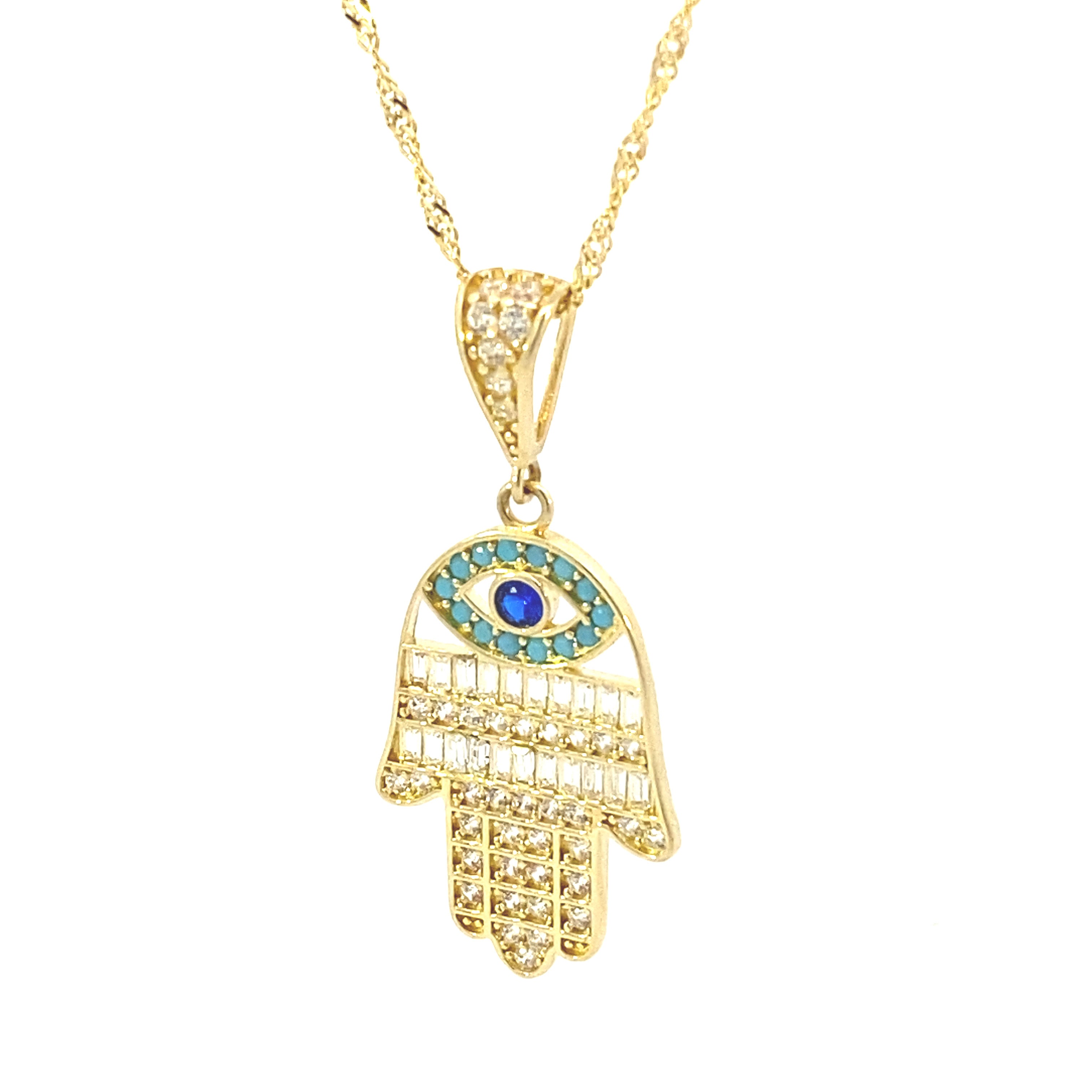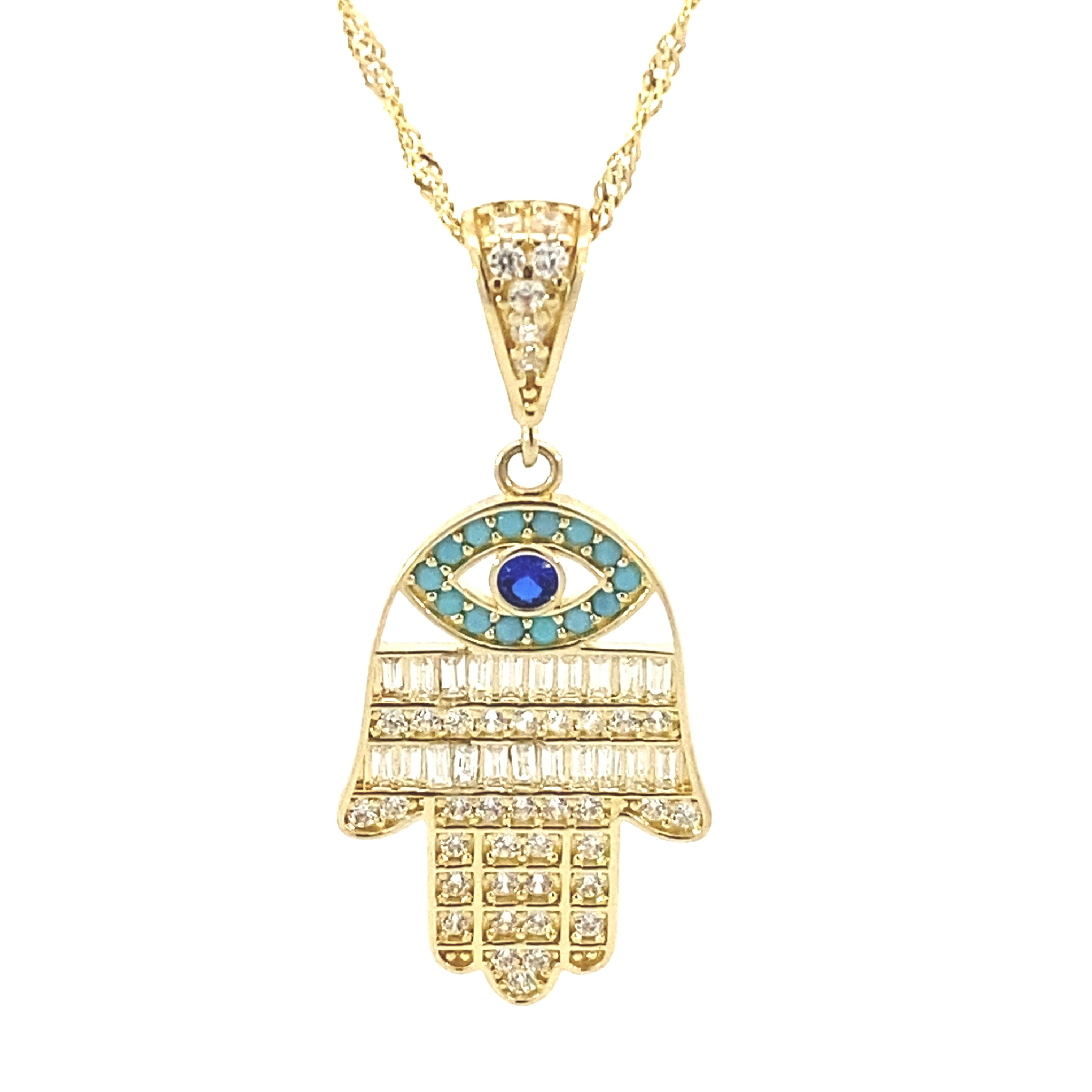 Hamsa Crystal Evil Eye Necklace 10K Gold